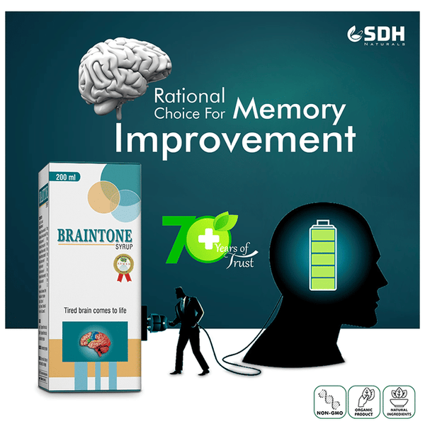 SDH Naturals Braintone Syrup is formulated with herbs like shankhpushpi, brahmi, yashtimadhu, and ashwagandha, which can help improve alertness, concentration, and attention.
