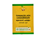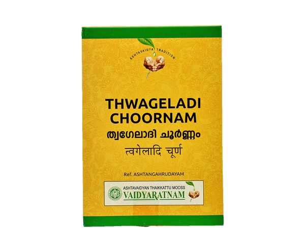 Vaidyaratnam Thwageladi Choornam is a traditional Ayurvedic powder made with plant-based ingredients. Commonly prepared following classical Ayurveda practices, this herbal blend is also known as Twageladi Choornam.