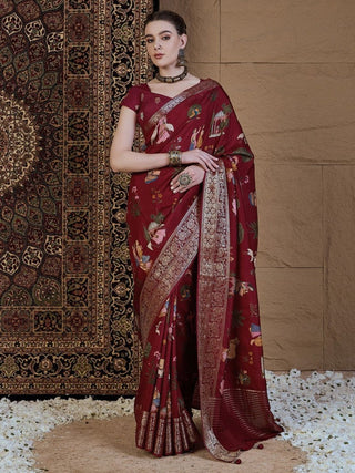 Anouk Floral Printed Embellished Beads and Stones Pure Chiffon Saree Product Details Design Details Maroon and white saree Floral printed saree with embellished border  Has beads and stones detail The saree comes with an unstitched blouse pieceThe blouse worn by the model might be for modelling purpose only. Check the image of the blouse piece to understand how the actual blouse piece looks like. Size & Fit Length: 5.5 metres plus 0.8 metre blouse piece Width: 1.06 metres (approx.) Material & Care Saree Fabric: Pure Chiffon,Blouse Fabric: Silk Blend,Dry Clean Specifications Print or Pattern Type: Floral Occasion: Party Ornamentation: Beads and Stones Border: Embellished Blouse Fabric: Silk Blend Blouse: Blouse Piece Saree Fabric: Pure Chiffon Wash Care: Dry Clean Legal Disclaimer: Product colour may slightly vary due to photographic lighting sources or your monitor settings.