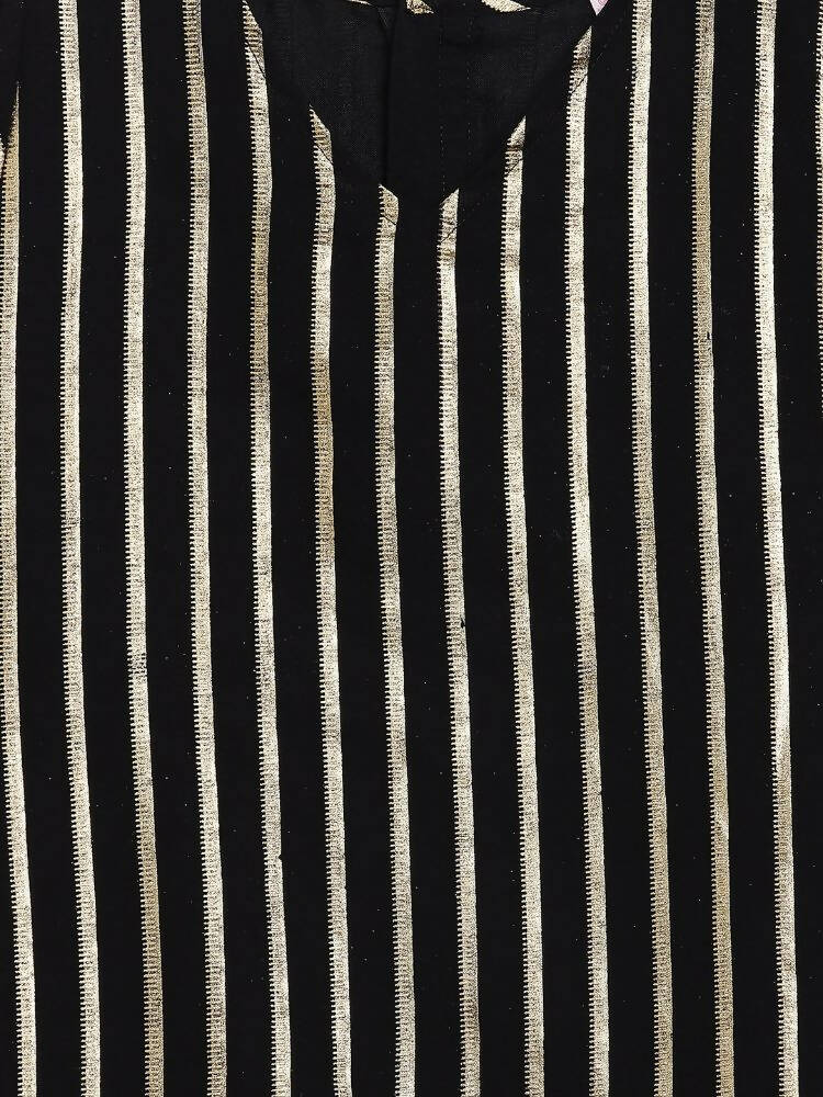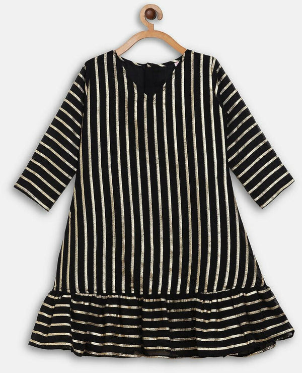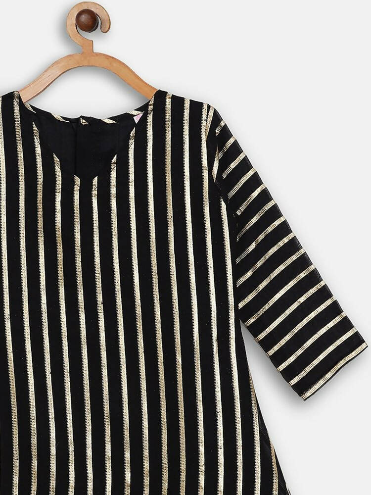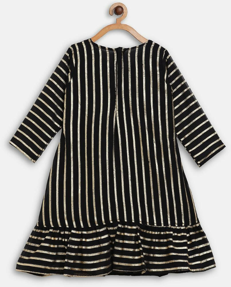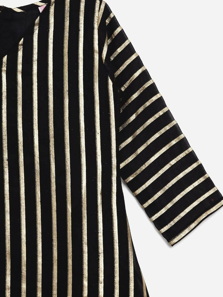 Ahalyaa Black Georgette Stripped Gold Printed Kids Kurta Pant Set For Girls Black 2-piece set by Ahalyaa for girls in lightweight georgette. Easy c...