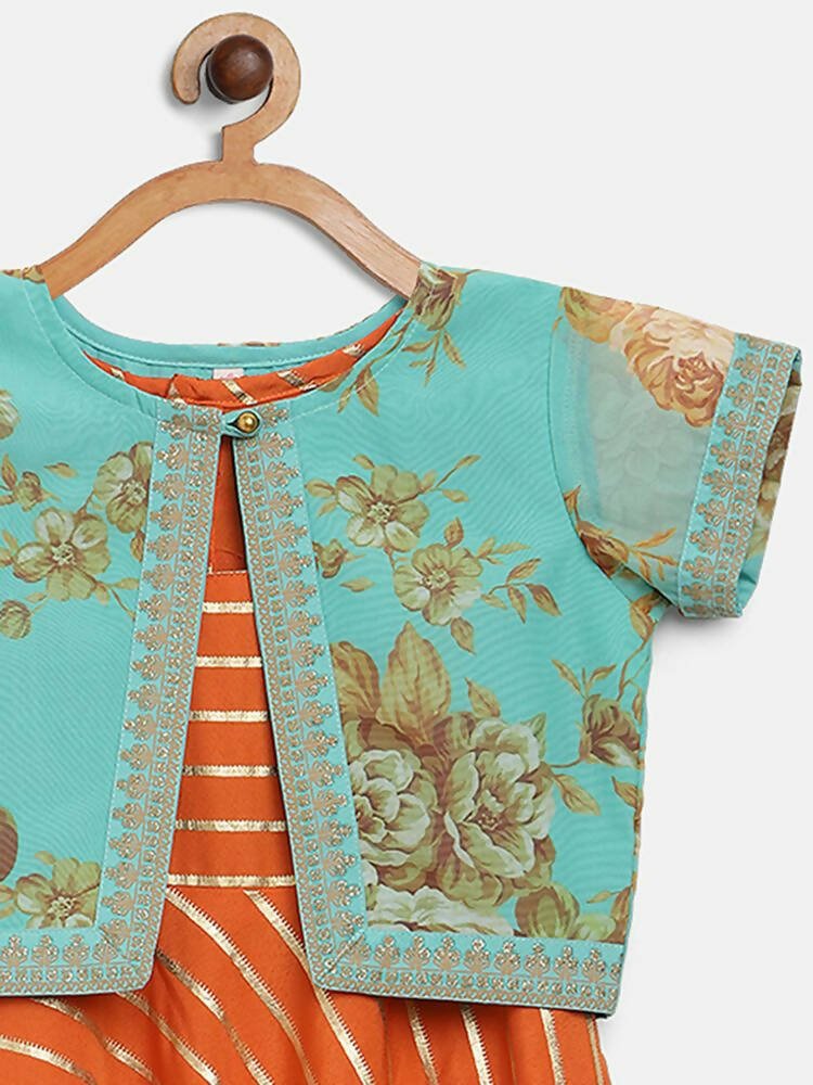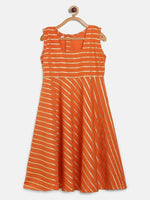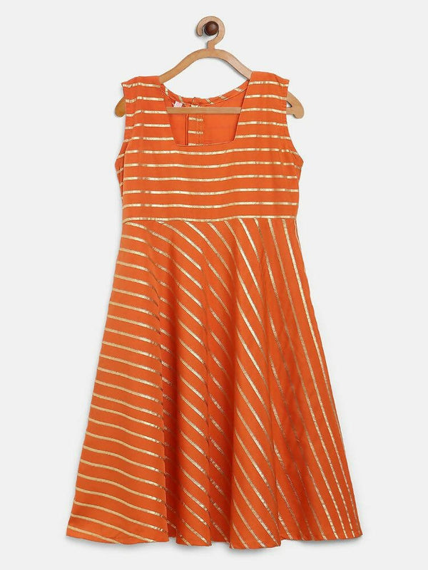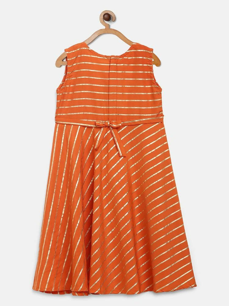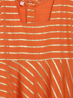 Ahalyaa Orange Crepe Gold Stripped Printed Kids Dress With Jacket For Girls