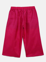 This rich-looking kurta set is an ideal festive pick for little girls. It's a set of 2 pieces- a pallazo and a kurta, comfortable yet elegant. The pink-red kurta set is printed all over with a metallic print to give it a rich look. Wash In Cool Water, Use Mild Detergent, Do Not Bleach, reverse iron, wash dark colors separately, and do not soak.