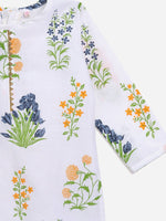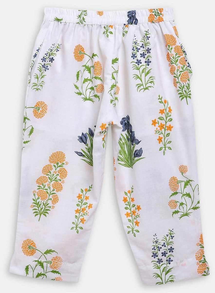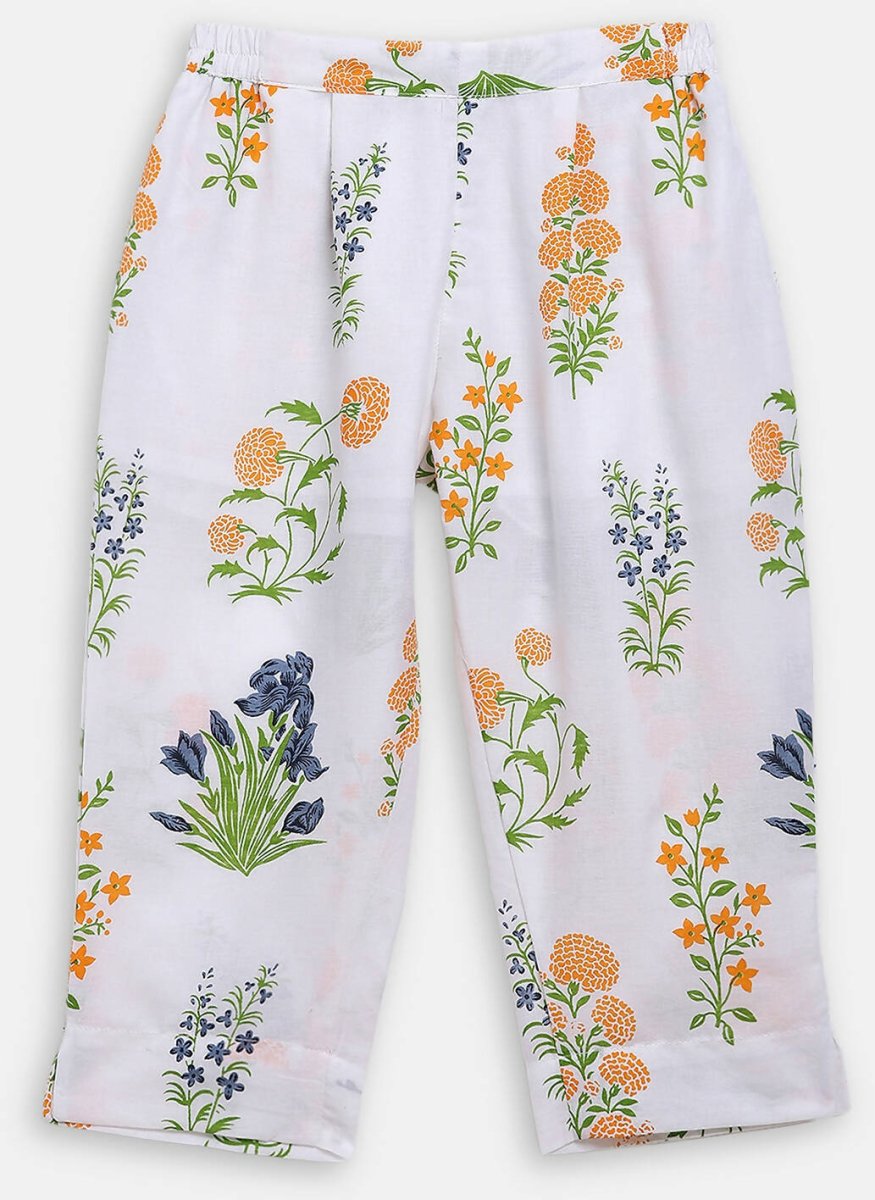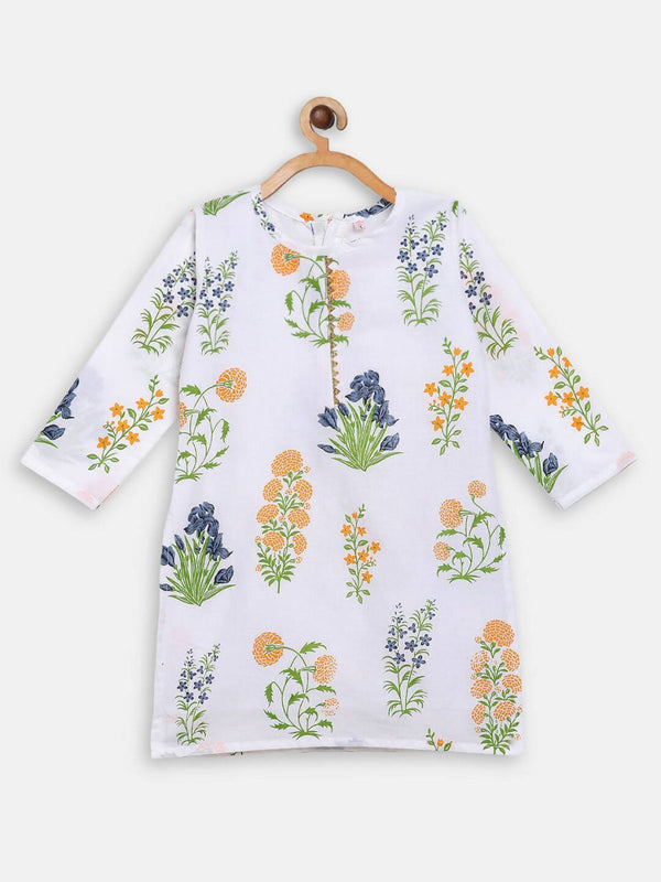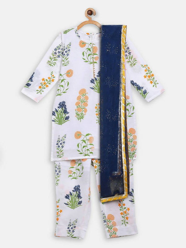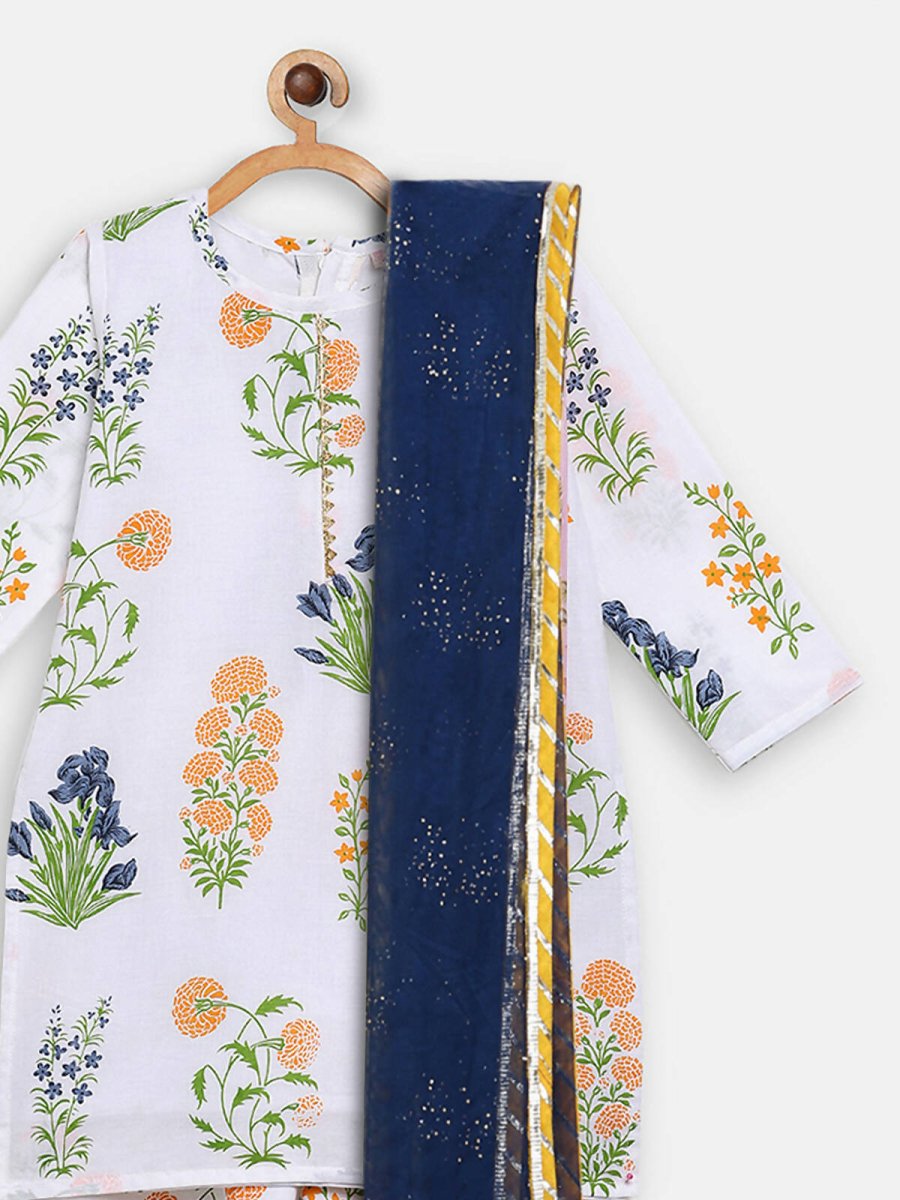 Ahalyaa White Cotton Straight Floral Printed Kids Kurta Pant Sets With Dupatta For Girls