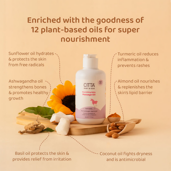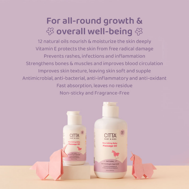 • Nurture, moisturize and protect your little ones skin with CITTAs Nourishing Baby Massage Oil . The nourishing blend of 12 oils for baby oil massage helps fight dryness, nourish, relax, prevent rashes and skin irritation, and strengthen the baby's bones and muscles. Naturally protected skin with toxin-free baby products for all babies and kids.