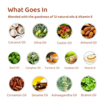 • Helianthus annuus (Sunflower) oil, Ricinus communis (Castor) Seed Oil, Sesamum Indicum (Sesame) Seed Oil, Cocus Nucifera (Coconut) oil,Olea europaea (Olive) Fruit Oil, Prunus Amygdalus Dulcis (Sweet Almond) Oil, Glyceryl Caprylate, Glyceryl Undecylenate, Vitamin E, Withania somnifera (Ashwagandha)Root Oil, Curcuma Longa (Turmeric) Root Oil, Cinnamomum camphora (Camphor) Bark Oil, Bacopa monniera (Brahmi) Leaf Oil, Ocimum Basilicum (Basil) Oil, Cinnamomum zeylanicum (Cinnamon) bark Oil )