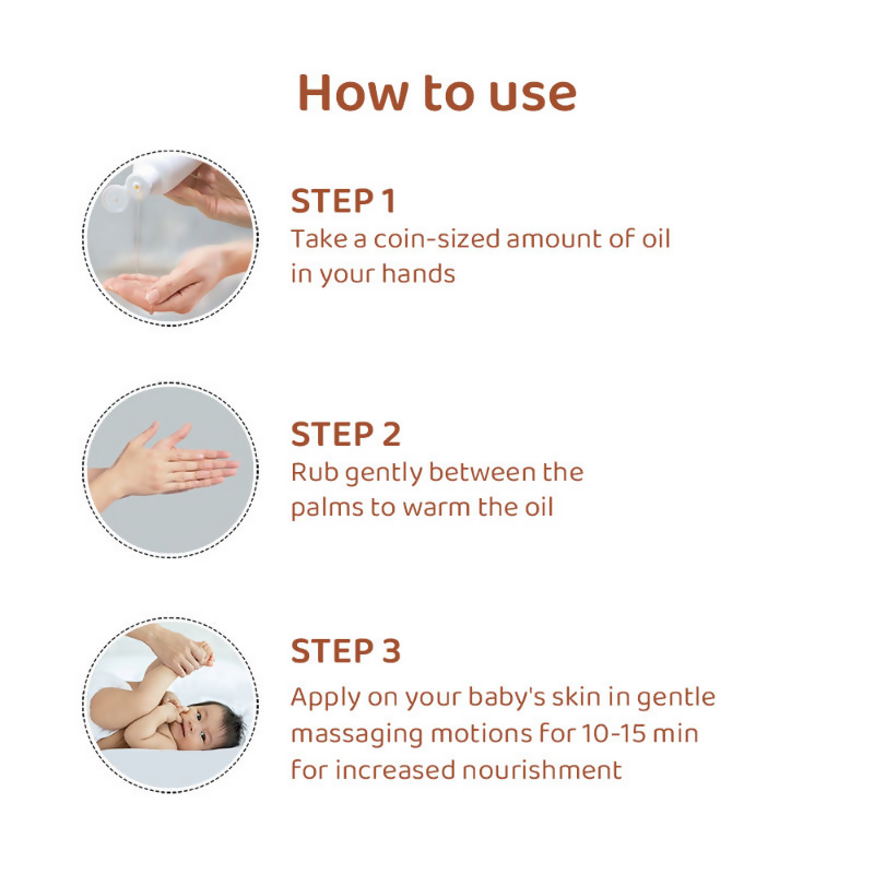 • Pour the oil on your hands and apply it on the baby’s skin. Massage it for some time till the oil gets absorbed in the skin.