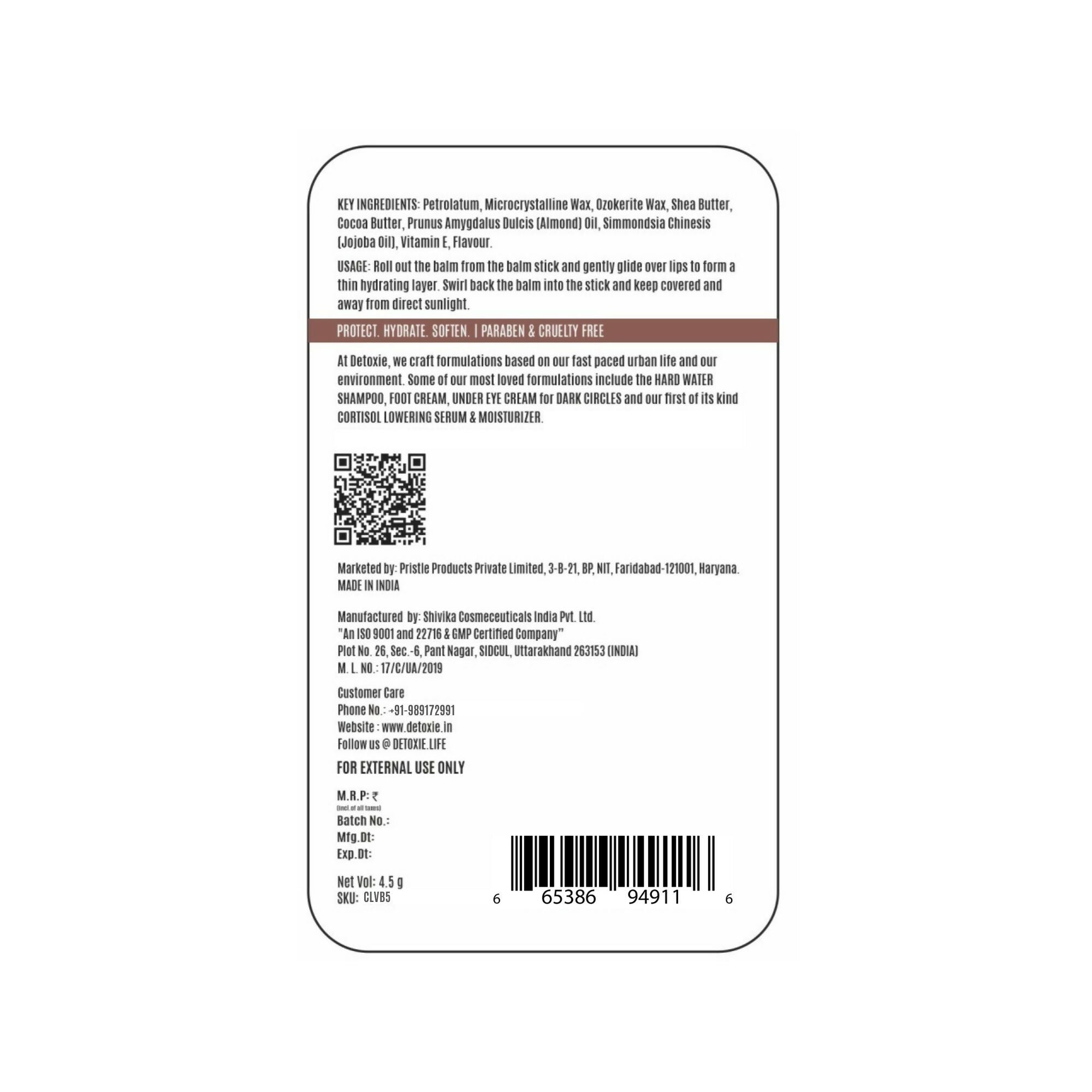 Detoxie Cocoa Vanilla Lip Balm is thoughtfully crafted with a blend of natural ingredients including shea butter, cocoa butter, almond oil, jojoba oil, liquorice, and vitamin E. Designed to add comfort to your daily lip care routine, this balm features the familiar aroma of cocoa and vanilla for a pleasant experience. Its smooth texture makes it easy to glide on and convenient for everyday use.