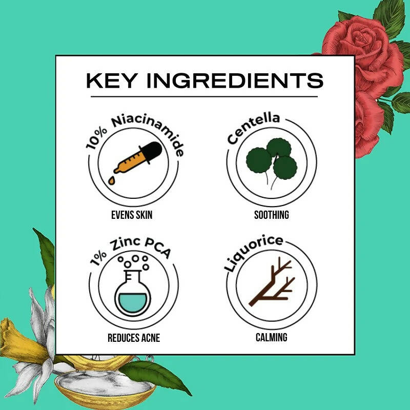 • This serum, formulated especially for sensitive Indian skin is power packed with Niacinamide (Vitamin B3) which controls sebum, and maintains the skin’s barrier, Zinc PCA which reduces acne scars and Centella and Liquorice which soothes skin.