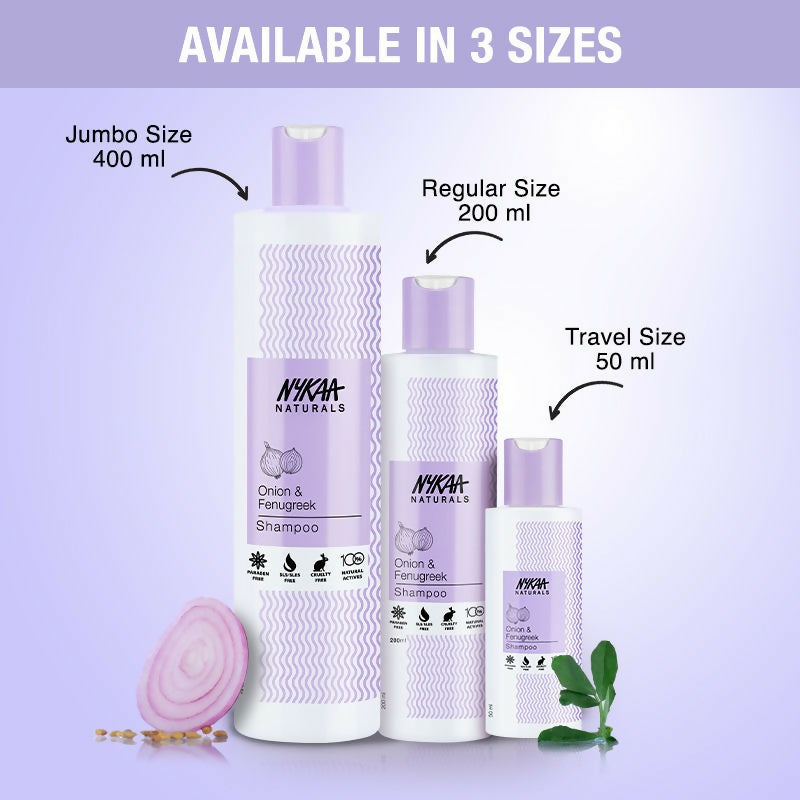 • Nykaa's Onion & Fenugreek Shampoo is a hair cleanser that promotes healthy growth and strengthens follicles while moisturising your hair from root to tip. It provides an instant boost of nourishment, so get ready to flaunt longer and stronger hair