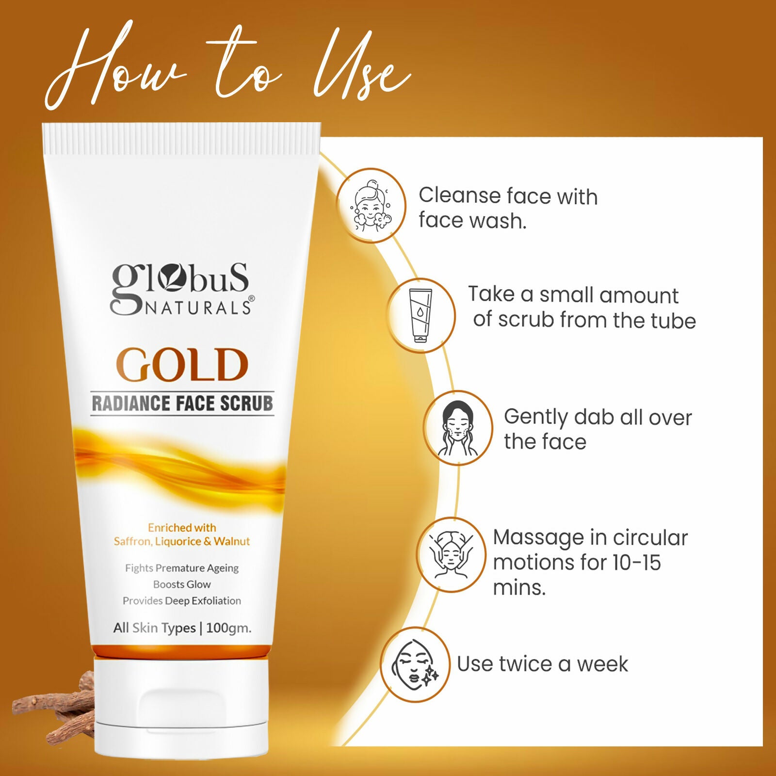 Globus Naturals Gold Radiance Face Scrub is crafted with a blend of botanical ingredients and gold bhasma. The formulation includes Aloe Vera, Saffron, Liquorice, Rose, Coconut, Walnut, and Carrot extracts, combined through a traditional approach. The scrub is designed to help cleanse the skin’s surface by removing accumulated impurities and dead skin particles.