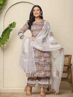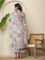 Yufta Beige Cotton Geometric Print Straight Kurta Pant Dupatta Set