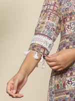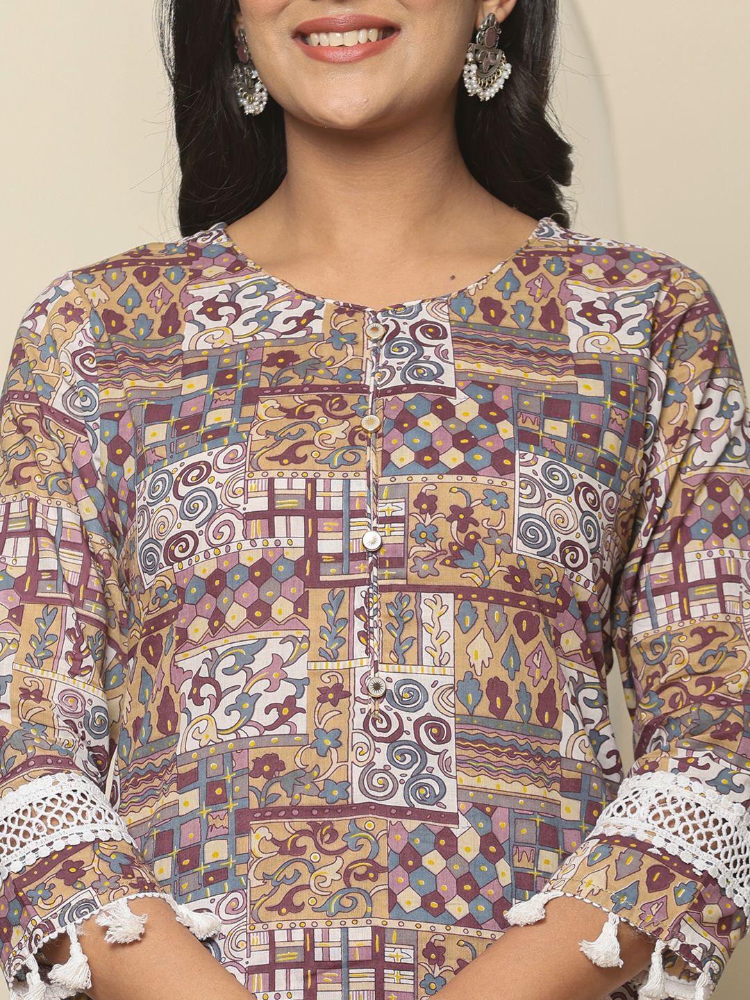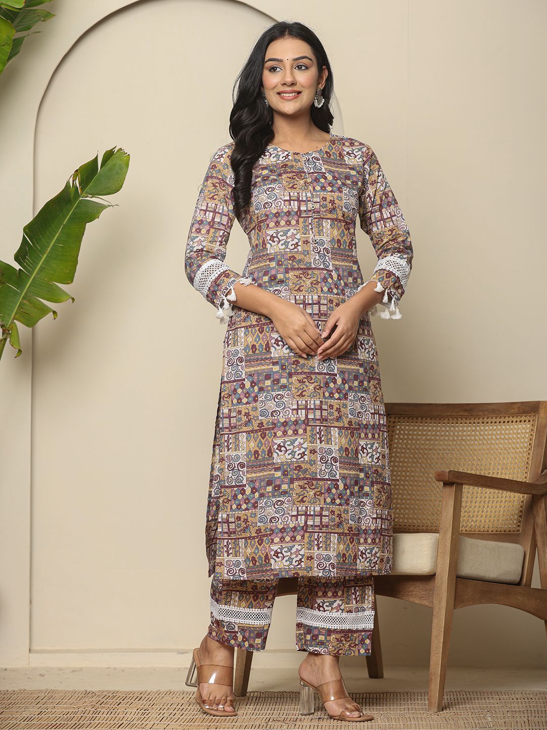 Beige Geometric Print Straight kurta Trouser Dupatta Set,Kurta Design Geometric,Lace Work Straight Shape Three quarter Regular Sleeves Round-Neck Calf Length Kurta Straight Hem Cotton Machine Weave Fabric Trouser Design: Printed one pocket Pure Cotton Trouser Slip-On Waist Size & Fit Material & Care Pure Cotton Dry Clean