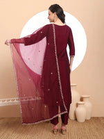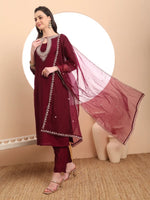 Yufta Burgundy Embroidered Kurta With Pant And Dupatta Comes With Cotton Lining