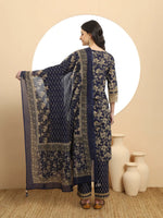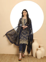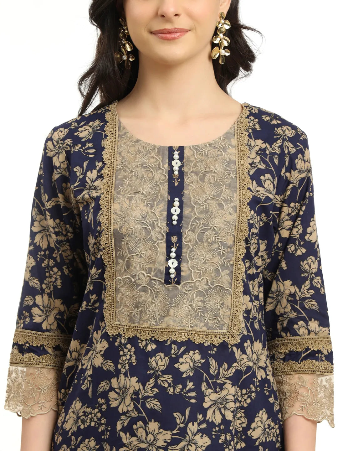 Yufta Cotton Navy Blue Kurta Dupatta Set With Lace Detailing