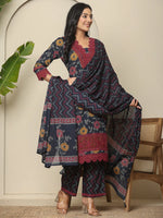 Navy blue, maroon and yellow printed kurta with trouser and dupatta