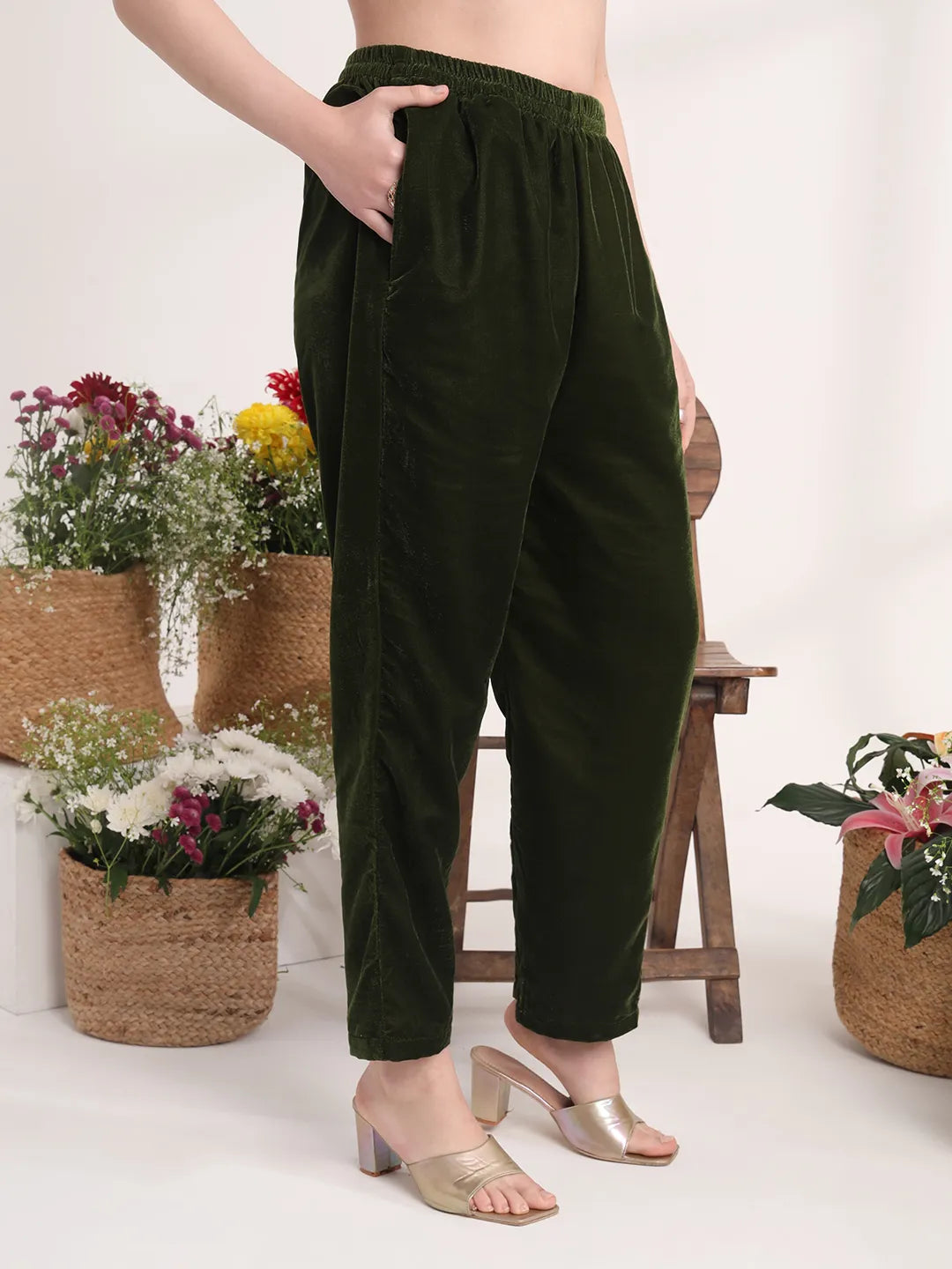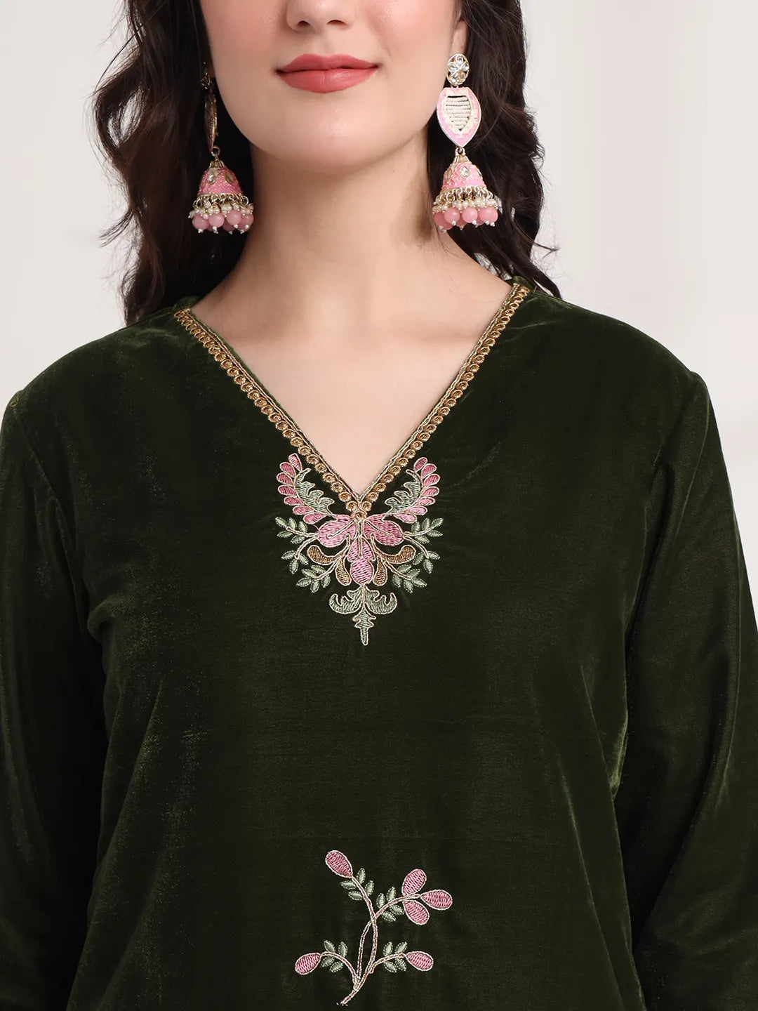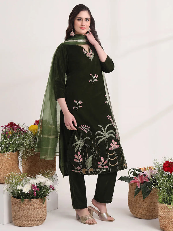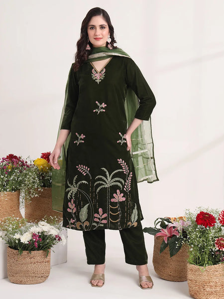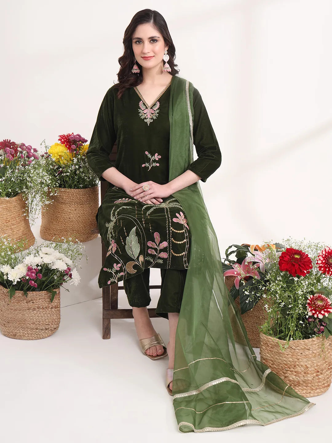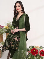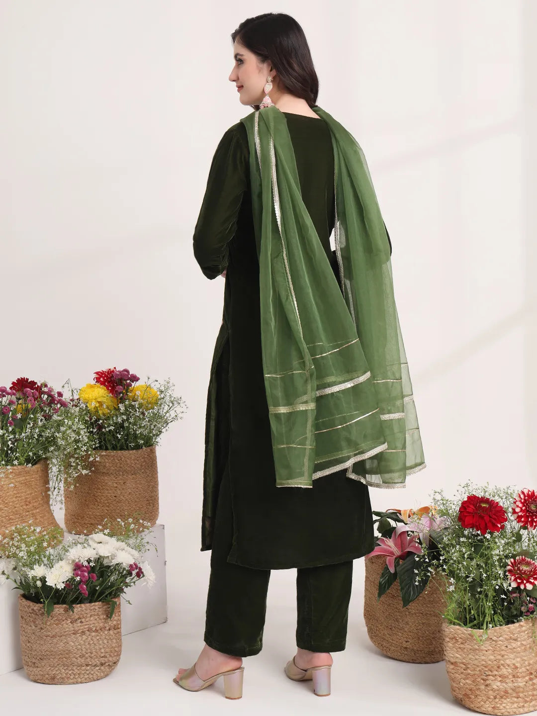 Olive Solid Straight Kurta Trouser Dupatta Set,