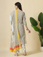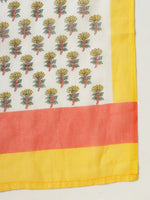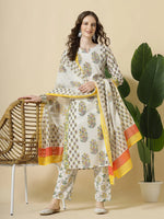 Yufta White And Yellow Floral Print Cotton Sequins Work Kurta Set With Pant & Dupatta