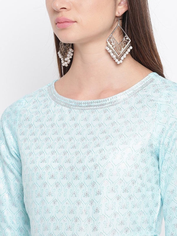 Blue and Charcoal grey printed woven layered maxi dress, has a round neck, three-quarter sleeves, and flared hem