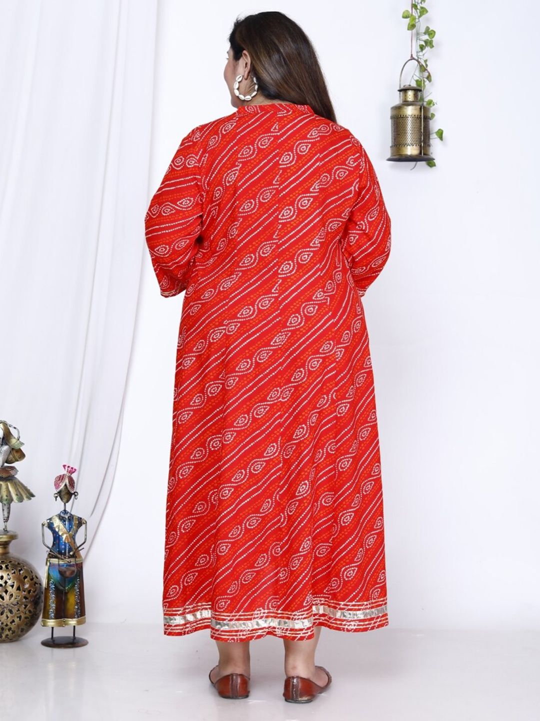 Swasti Bandhani Printed A-Line Maxi Ethnic Dress Product Details Red & white bandhani print a-line ethnic dress Mandarin collar Three-quar...
