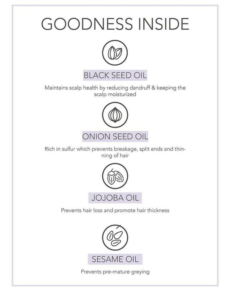Fabessentials Red Onion Black Seed Oil is a blend of nourishing oils such as Black seed oil, Argan oil, Bhringraj oil, Jojoba oil, Coconut oil and more to help reduce hair fall and boost hair growth. This recipe contains Onion juice which is known to promote hair growth by boosting the level of an antioxidant enzyme Catalase. It is also rich in Sulfur which nourishes the hair follicles & minimizes hair thinning and breakage. This oil with antibacterial properties keeps the scalp healthy and free of infection.