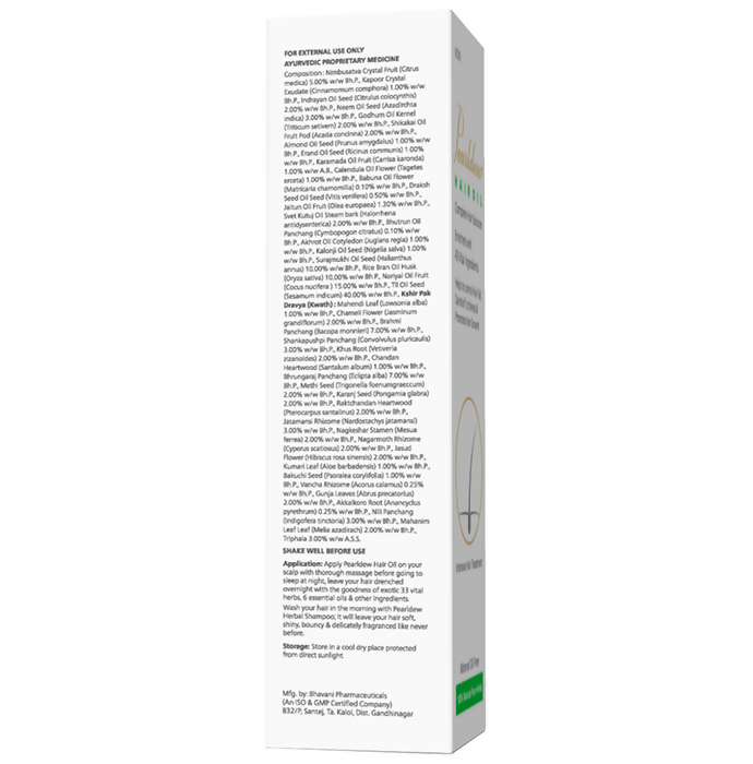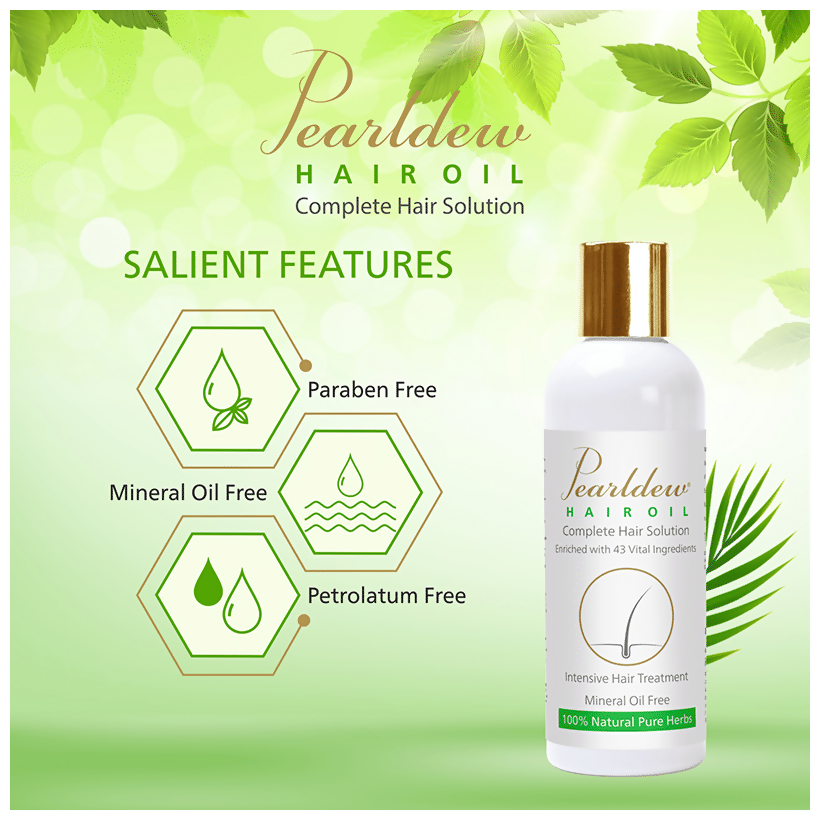 • Pearldew Hair Oil has quick absorption over the scalp and provides an intensive hair and scalp solution that not only controls hair fall effectively from the very first application but also takes care of all other issues like hair damage, thinning, dandruff, itchiness, premature greying, dryness and frizzy hair and split ends effectively. It also helps control sebum production in the hair follicles and promotes hair growth. Pearldew Hair Oil is made with the traditional Ayurvedic process of Kshir Pak Vidhi and consists of 22 highly effective herbs, 19 essential oils and 2 other vital ingredients. It is made with 100% natural ayurvedic herbs and has no side effects even after long-term use. We can call Pearldew Hair Oil as Ayurved ka Vardaan.