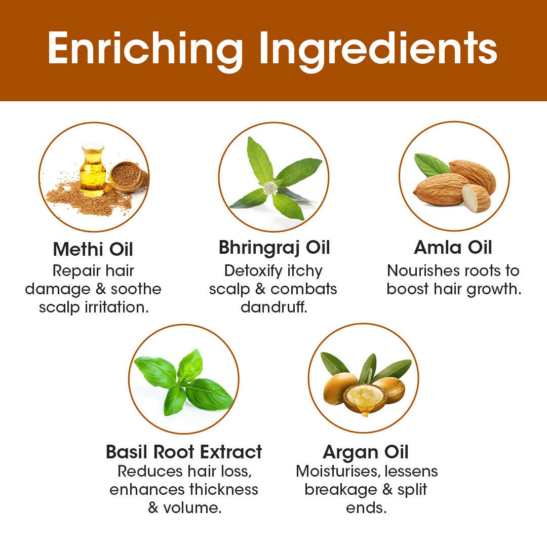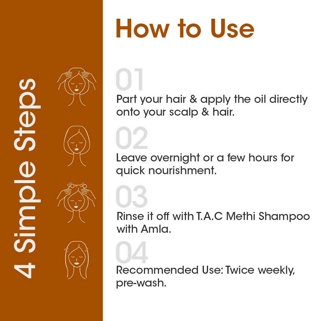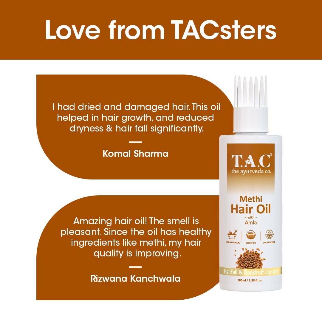 • T.A.C Methi Hair Oil is sourced from organically grown methi seeds and other potent ayurvedic herbs like amla via the cold-pressed method.