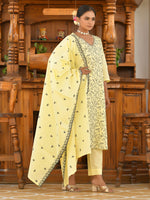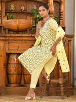 Vaasva Women Lemon Yellow Cotton Solid embroidered Suit set with embroidered dupatta & solid cotton pants(Kurta, Palazzo & Dupatta Set)