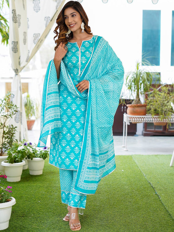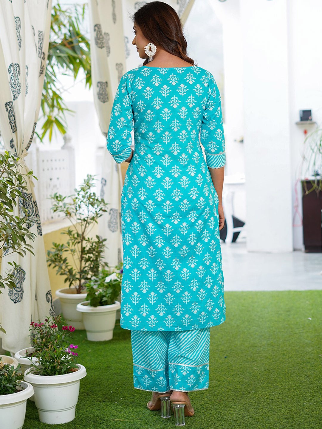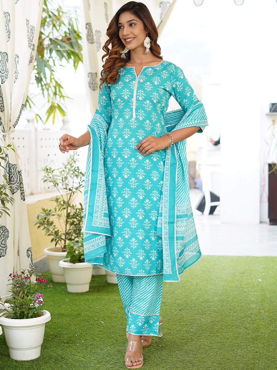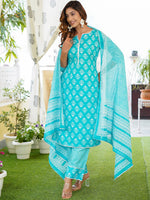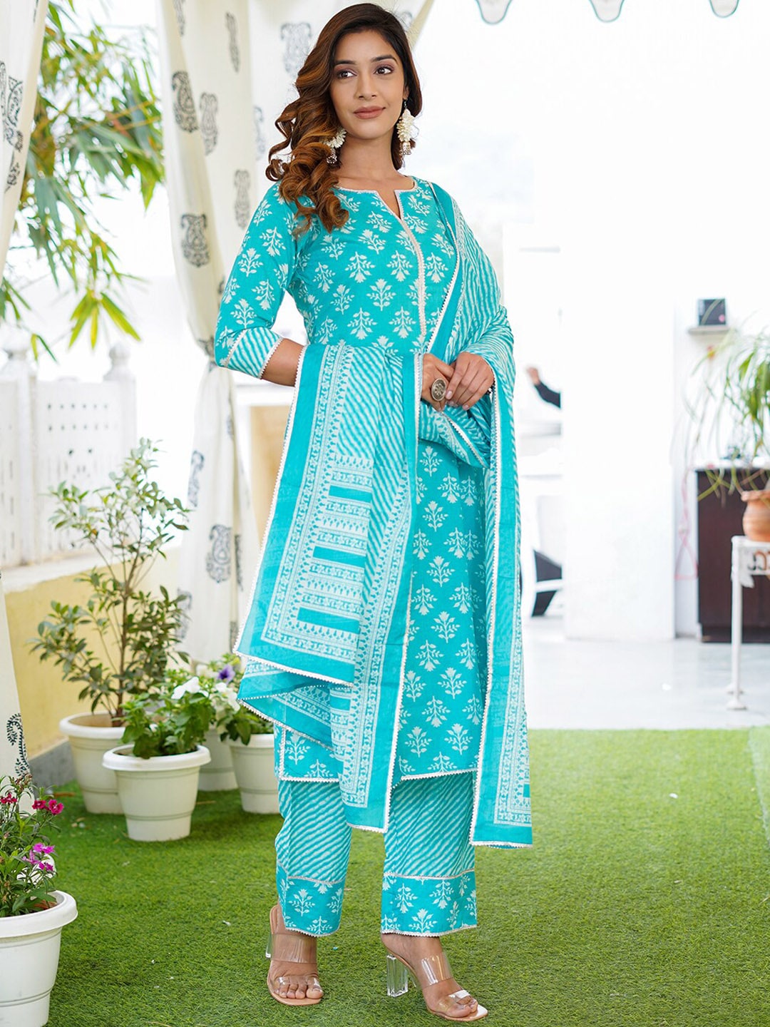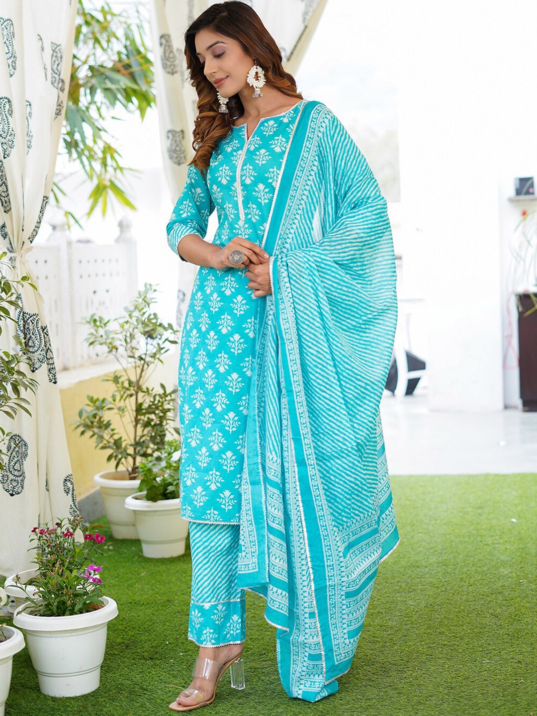 Turquoise blue and white printed Kurta with Trousers & dupatta