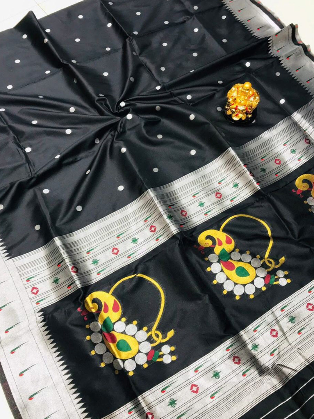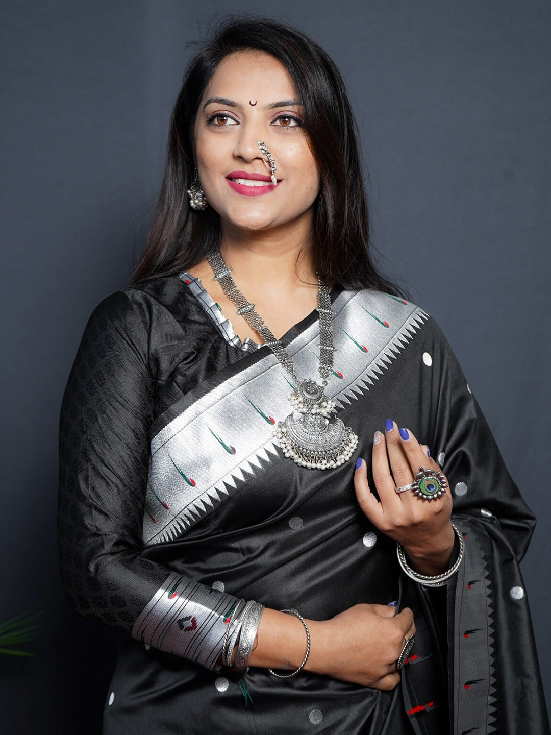 Kalini Geometric Woven Design Zari Silk Blend Paithani Saree Product Details Design Details Black and silver-toned paithani saree Geometric Wo...