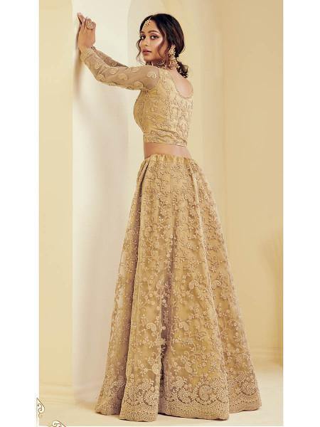 Golden Heavy Embroidered Net bridal Lehenga features a net with satin 2 layer with heavy quality can-can lehenga . embroidery is completed with cording. This Style is made in India and checked by hand to ensure high quality.