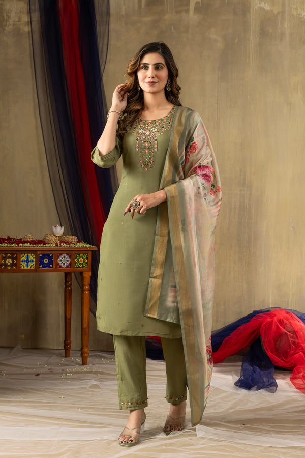 Lorenvalley Fashion Green Shimmer Gold Silk Multi Embroidery Thread With Hand Work Kurta Pant Dupatta