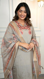 Lorenvalley Fashion Grey Roman Silk Embroidery Multi with Sequence Work Kurta Pant with Dupatta
