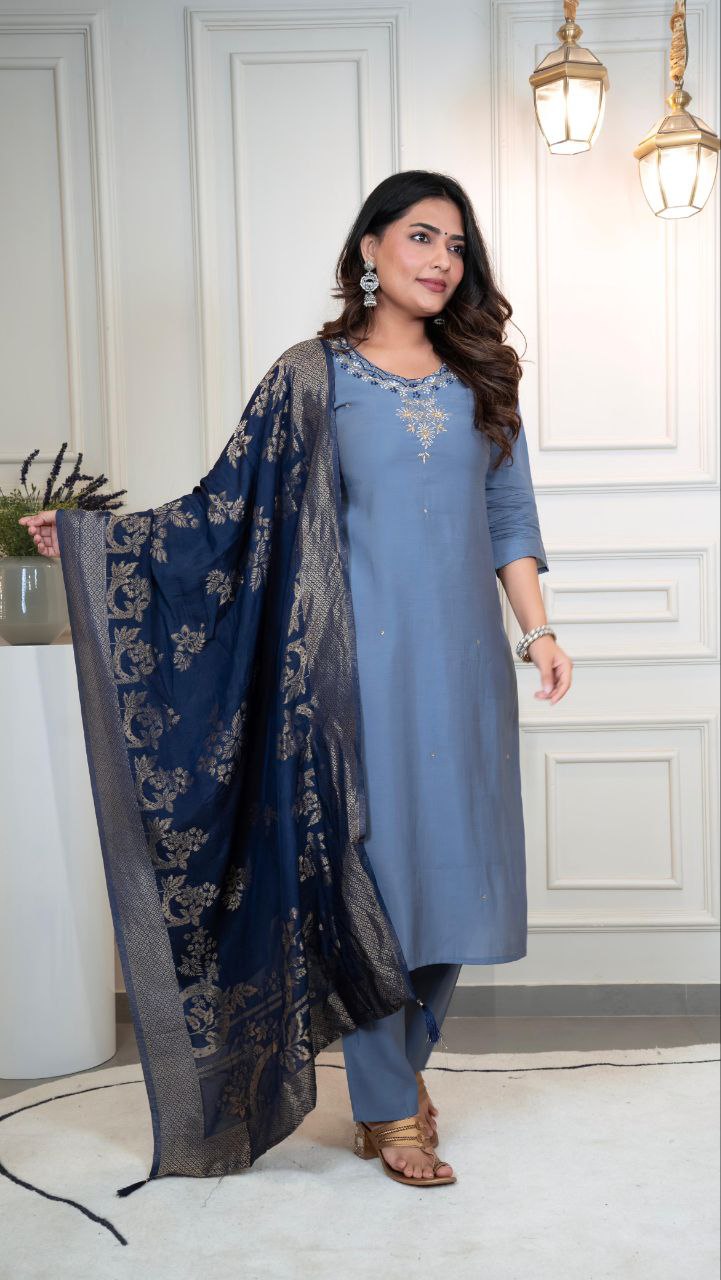 Lorenvalley Fashion Steelblue Roman Silk Hand Work Kurta Pant with Dupatta