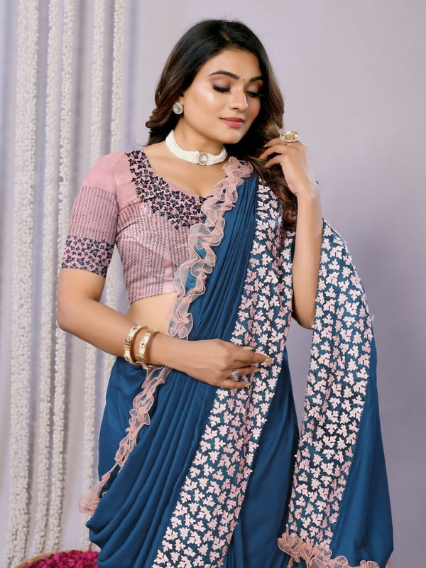 Teal Blue Silk Georgette Laser Cut Embroidery Wired Frills Saree - Norita Saumya Saree Color: Teal Blue Blouse Color: Pink Saree Fabric: Silk...