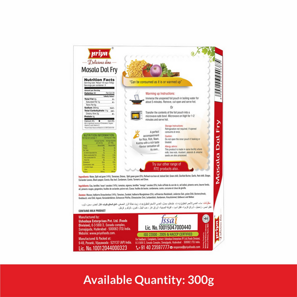 Priya Ready To Eat Masala Dal Fry About the Product:Priya’s Ready to Eat Masala Dal Fry is made out of premium toor dal cooked with blended spices...