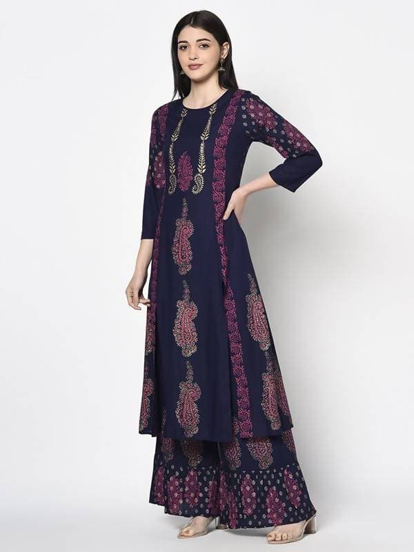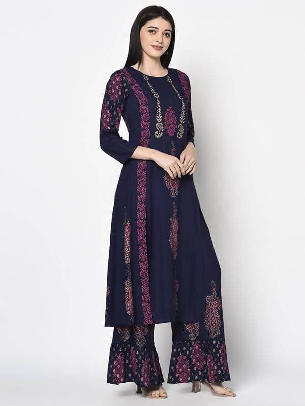 Aniyah Rayon Navy Blue Color Block print A-line Flared Long Kurta with two Front Slits (AN-215K):SPECIFICATIONS:- COLOUR :-       Navy Blue FABRIC:...