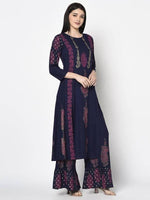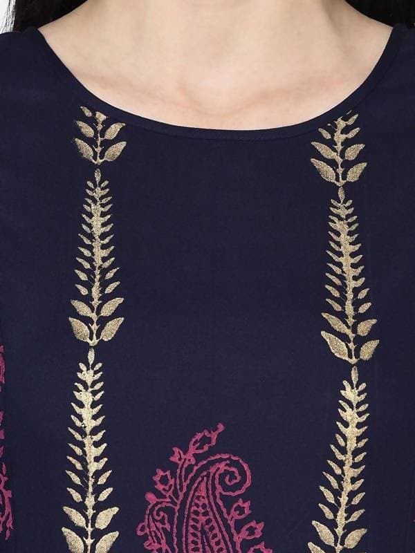 Aniyah Rayon Navy Blue Color Block print A-line Flared Long Kurta with two Front Slits (AN-215K):