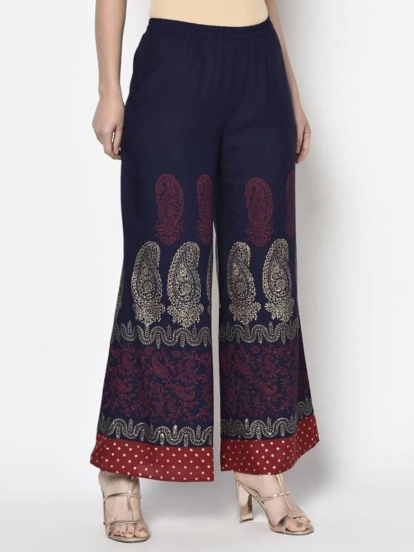 Aniyah Rayon Navy Blue Color Block Print Flared slip-on Palazzo (AN-178K):SPECIFICATIONS:- Palazzo:-    COLOUR :-    Navy Blue    FABRIC:-     100...