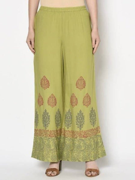 Aniyah Rayon Parrot Green Color Block Print Flared Slip-On Palazzo (AN-196K) - S