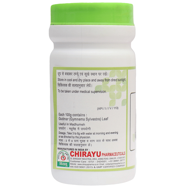 Chirayu Gudmar Churna About the product:Chirayu Gudmar Churna is an Ayurvedic formulation combining the power of Gudmar (Gymnema Sylvestre) and oth...