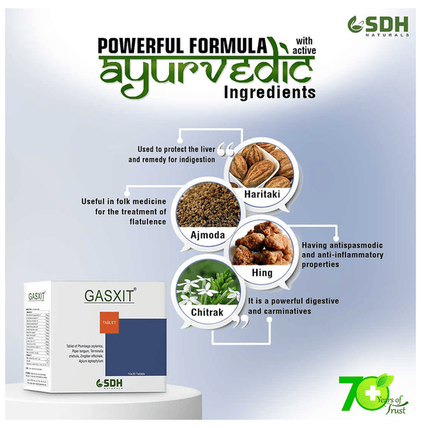SDH Naturals Gasxit TabletGasxit Tablet is an Ayurvedic digestive support supplement that brings together a potent blend of herbs with potential ca...