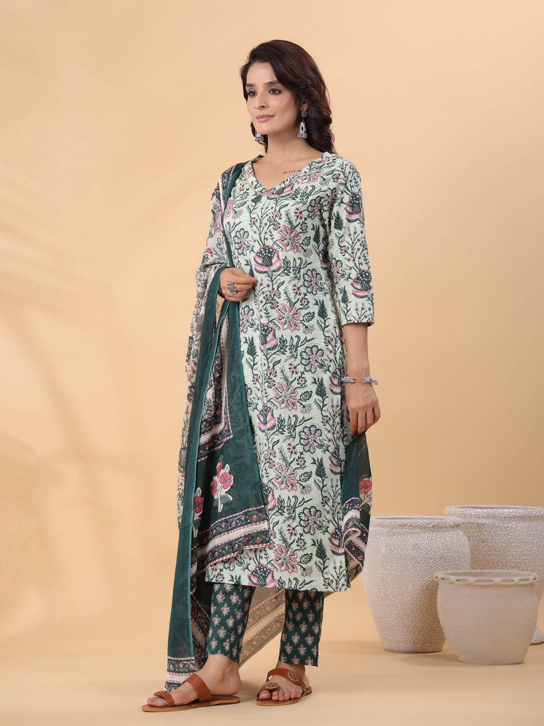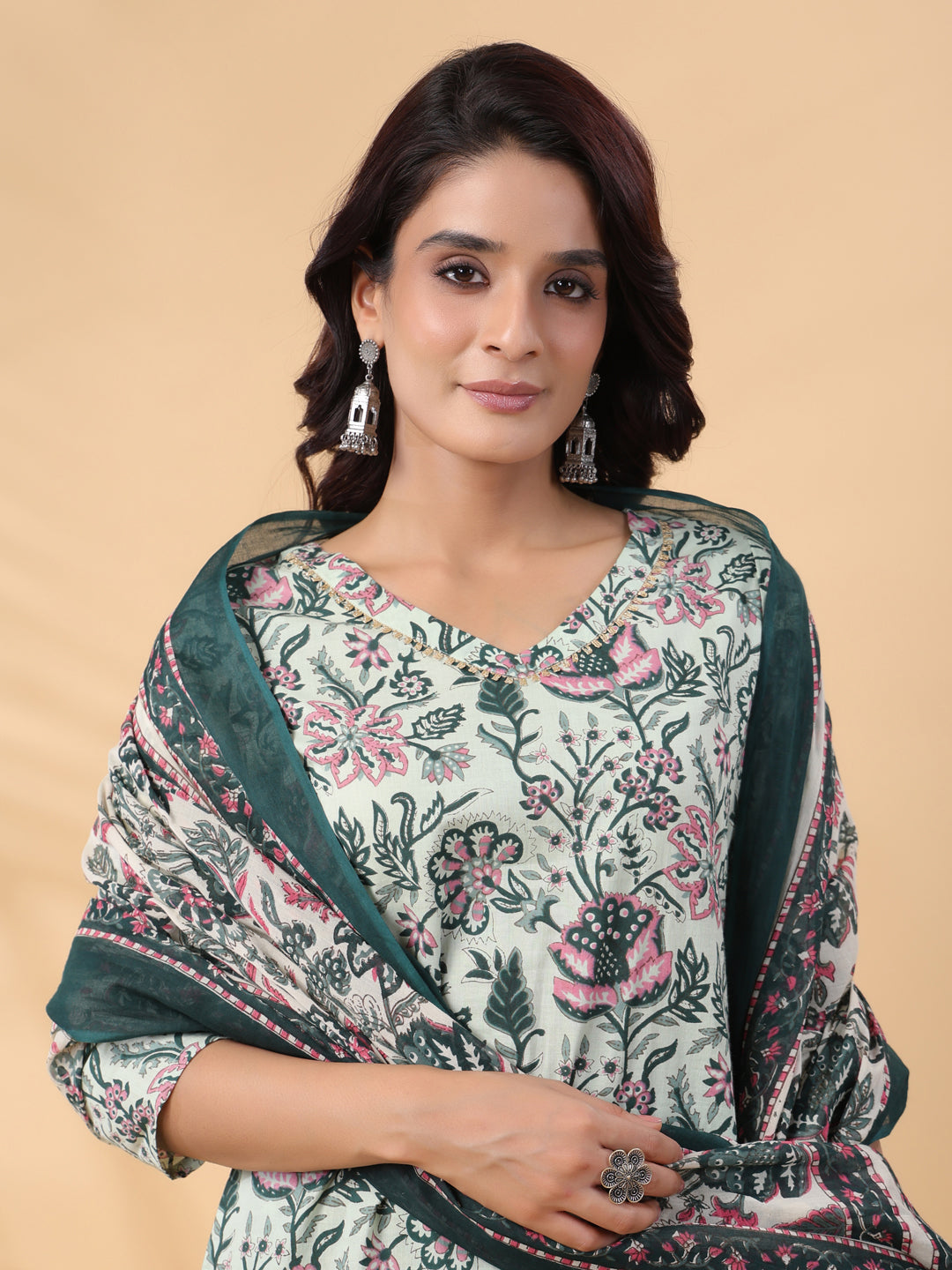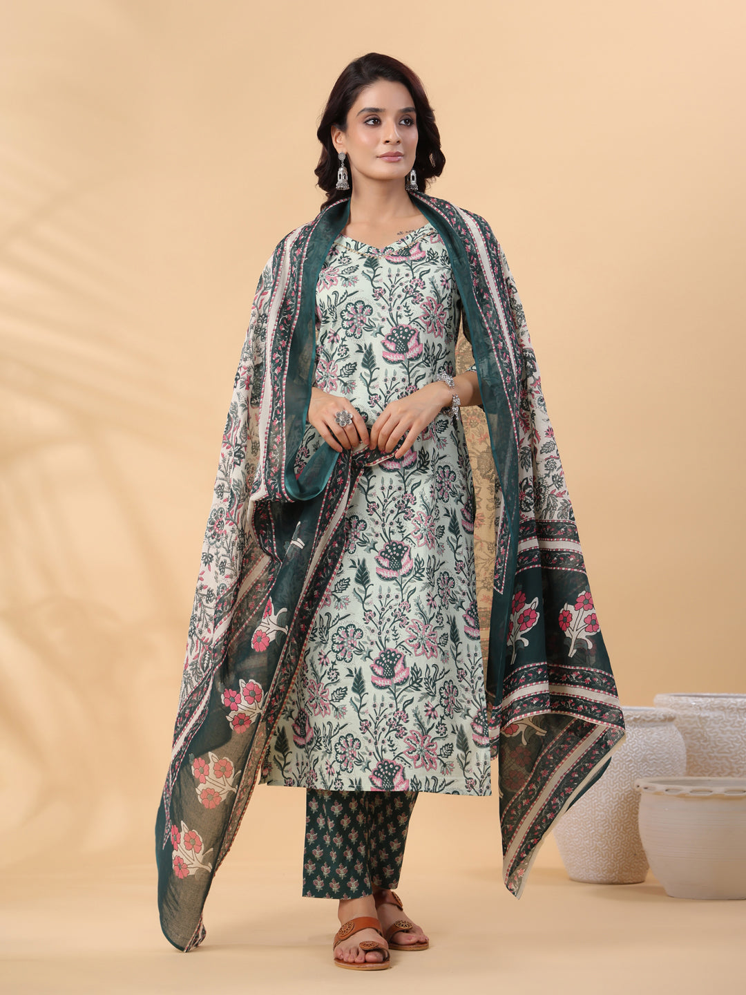 Janasya Regular Cambric Mint Floral V-Neck Kurta,Bottom & Dupatta