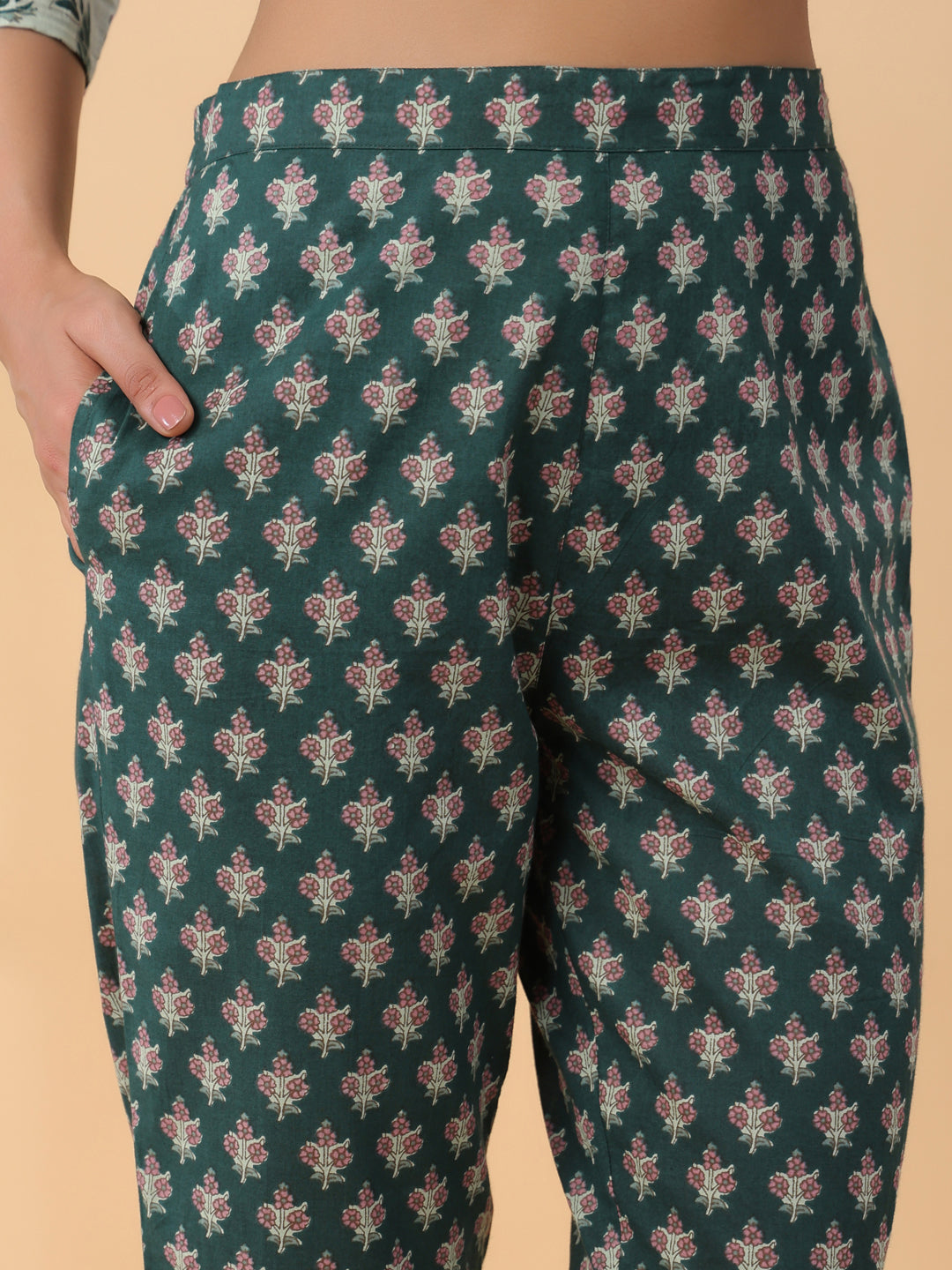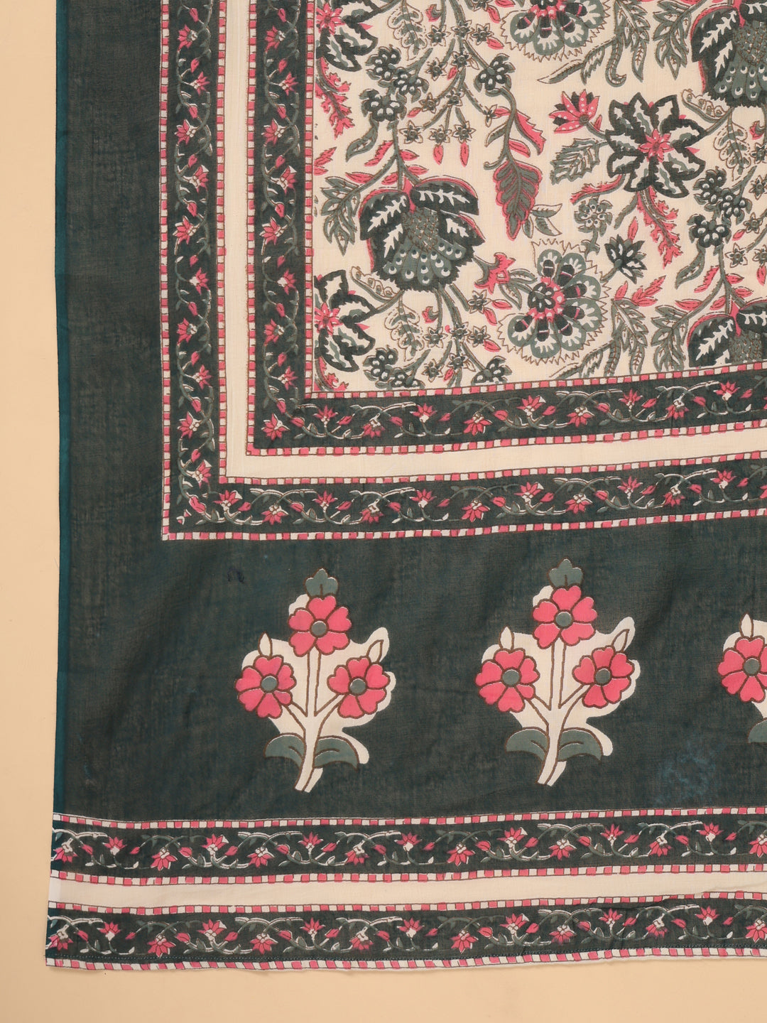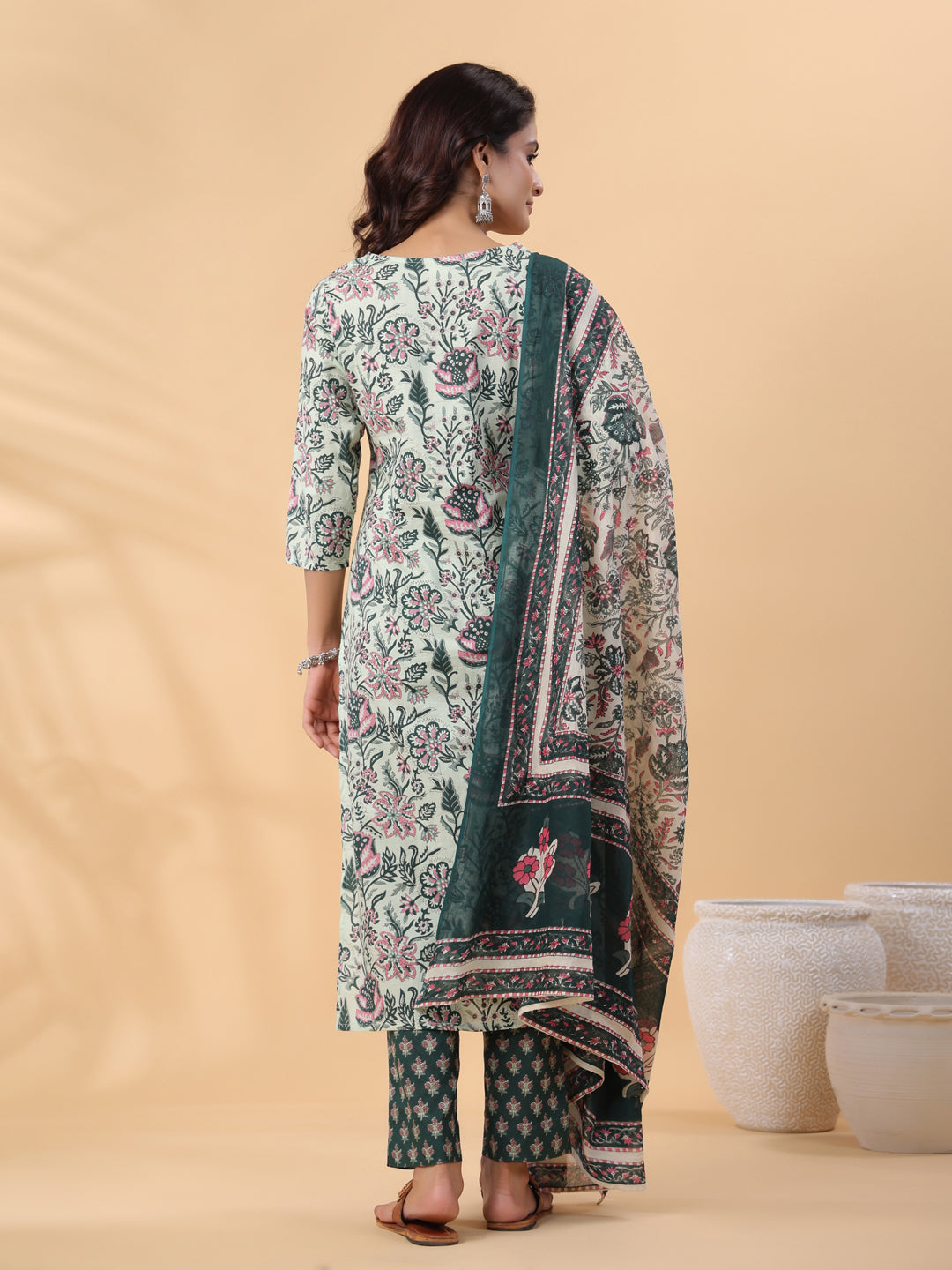 Janasya Regular Cambric Mint Floral V-Neck Kurta,Bottom & Dupatta