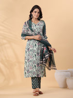 Janasya Regular Cambric Mint Floral V-Neck Kurta,Bottom & Dupatta - XS