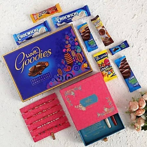 Designer Rakhis and LuvIt Chocolate Box: ComboProduct Details: Beads & Pearls Designer Rakhi- Set of 5 These designer rakhis highlight beads fo...