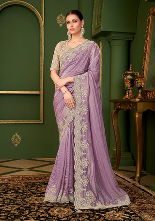 Monjolika Fashion Lavender Color Viscose Georgette Silk Saree With Heavy Work Blouse