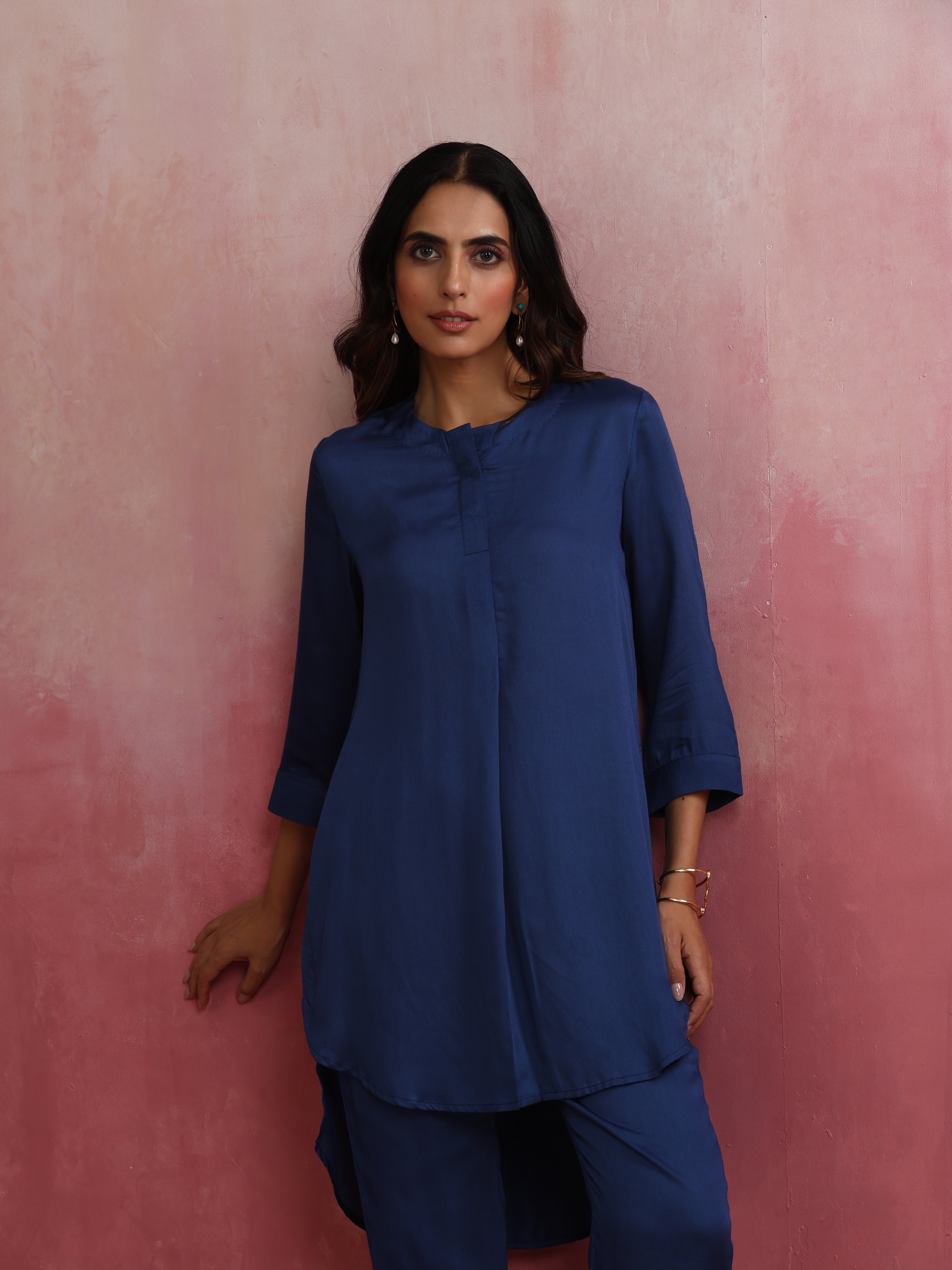 trueBrowns Blue Modal High Low Kurta Co-ord SetDescription Elevate your style with this blue modal high low kurta featuring hidden placket and knif...