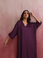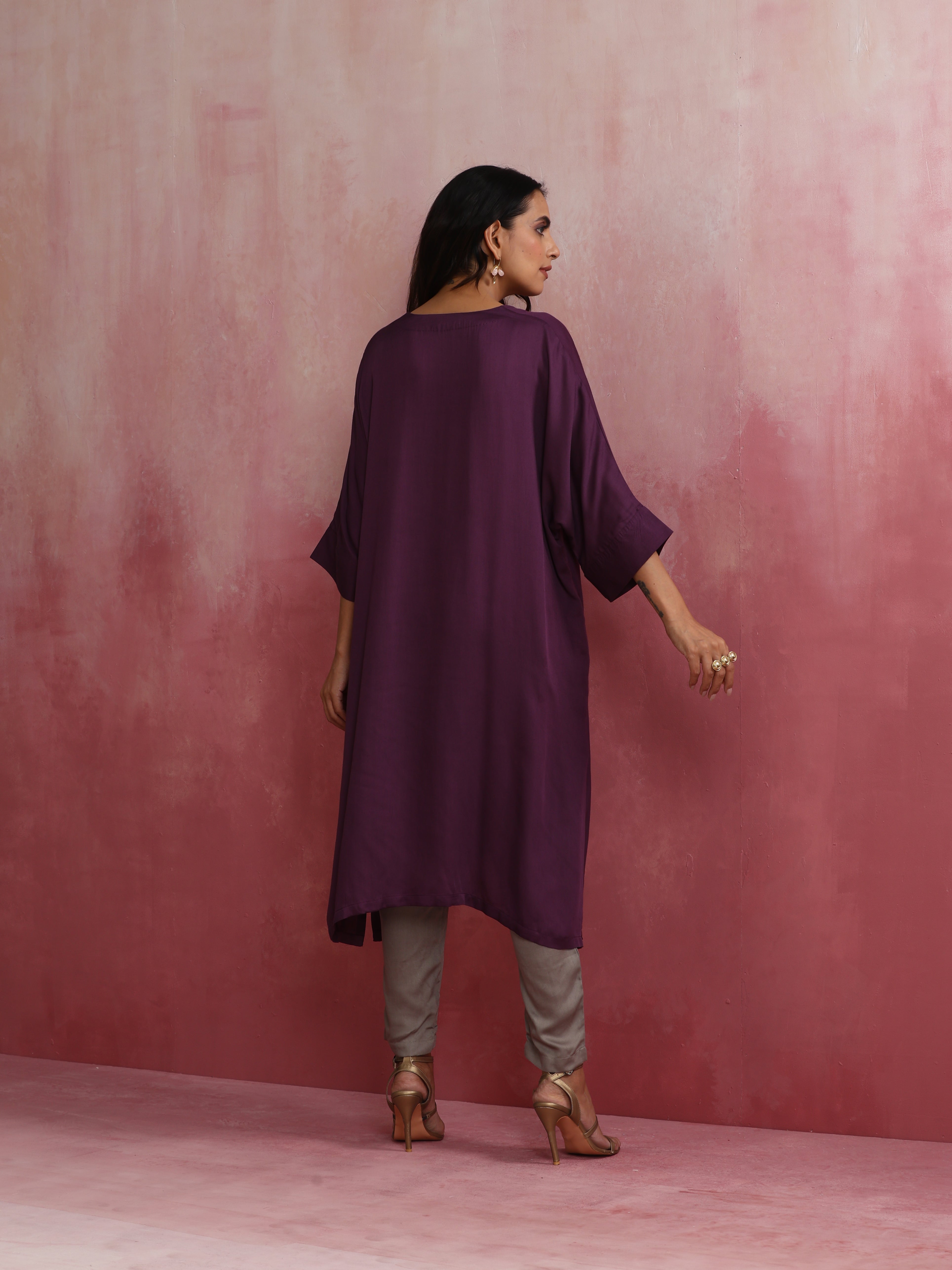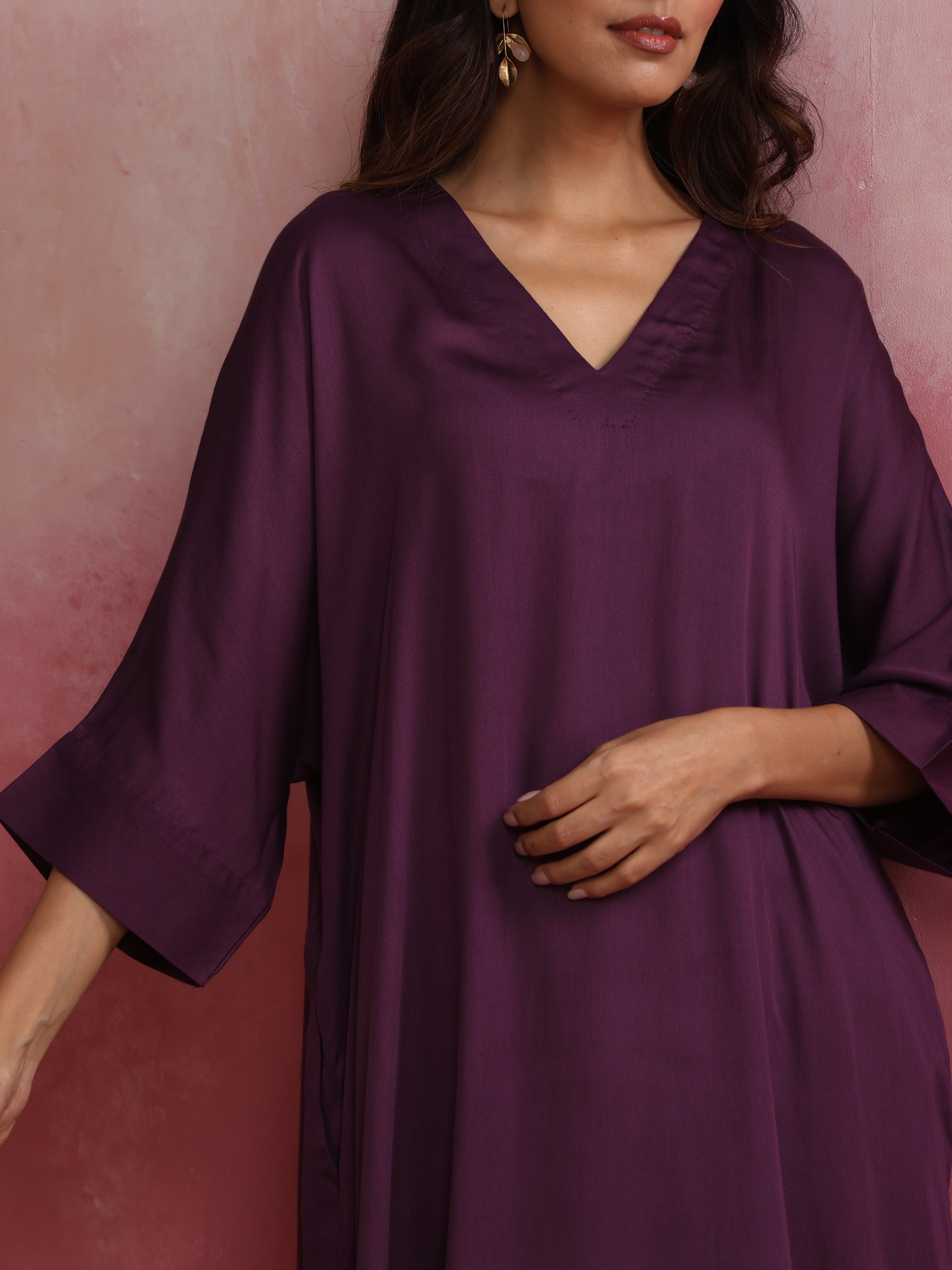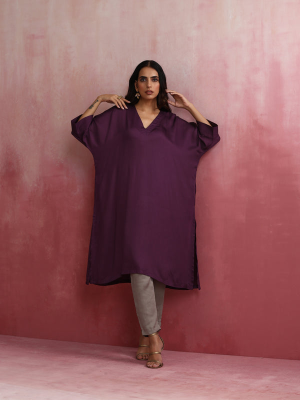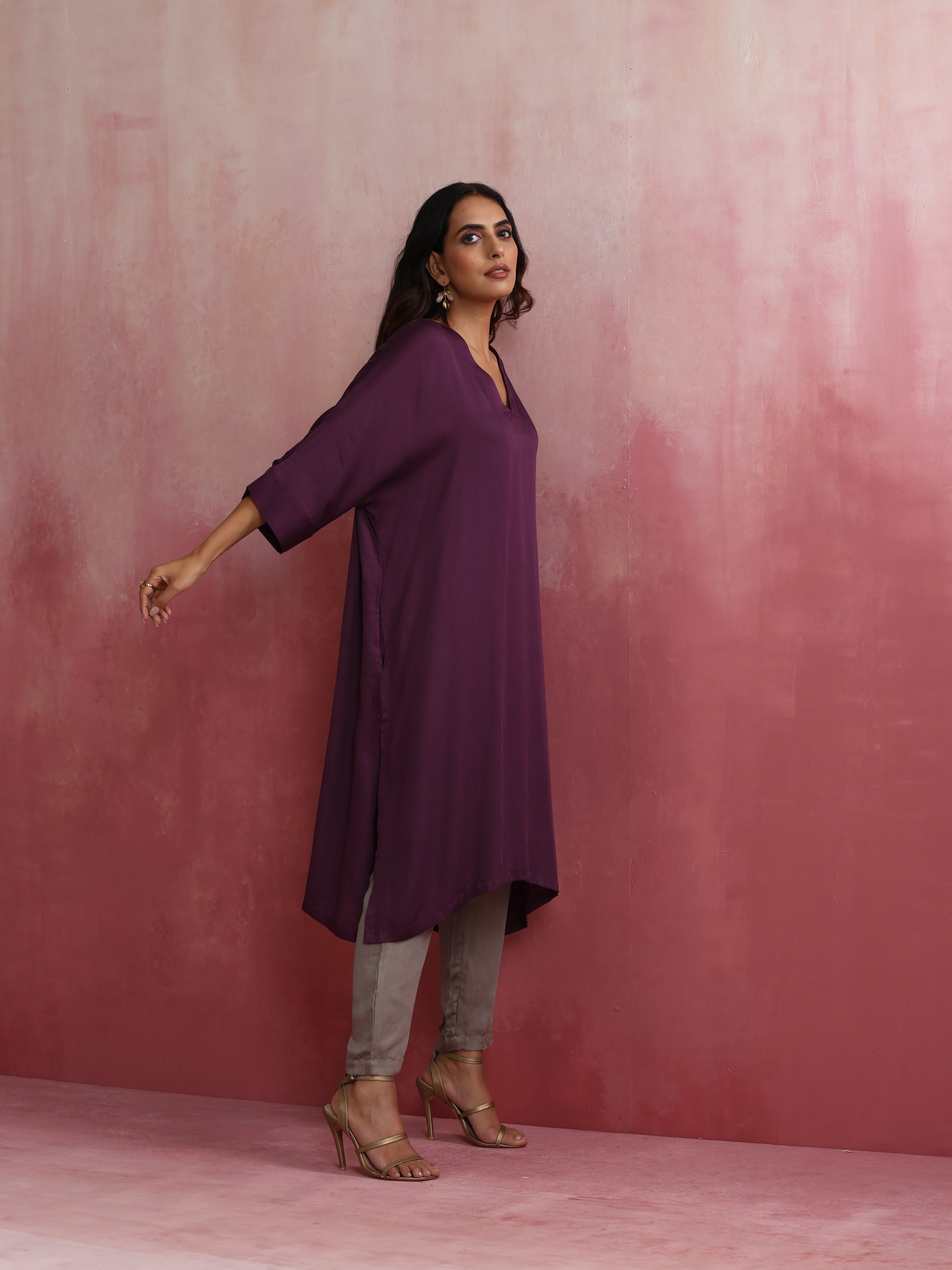 • Elevate your style with this purple modal kurta featuring kimono sleeves.