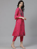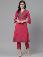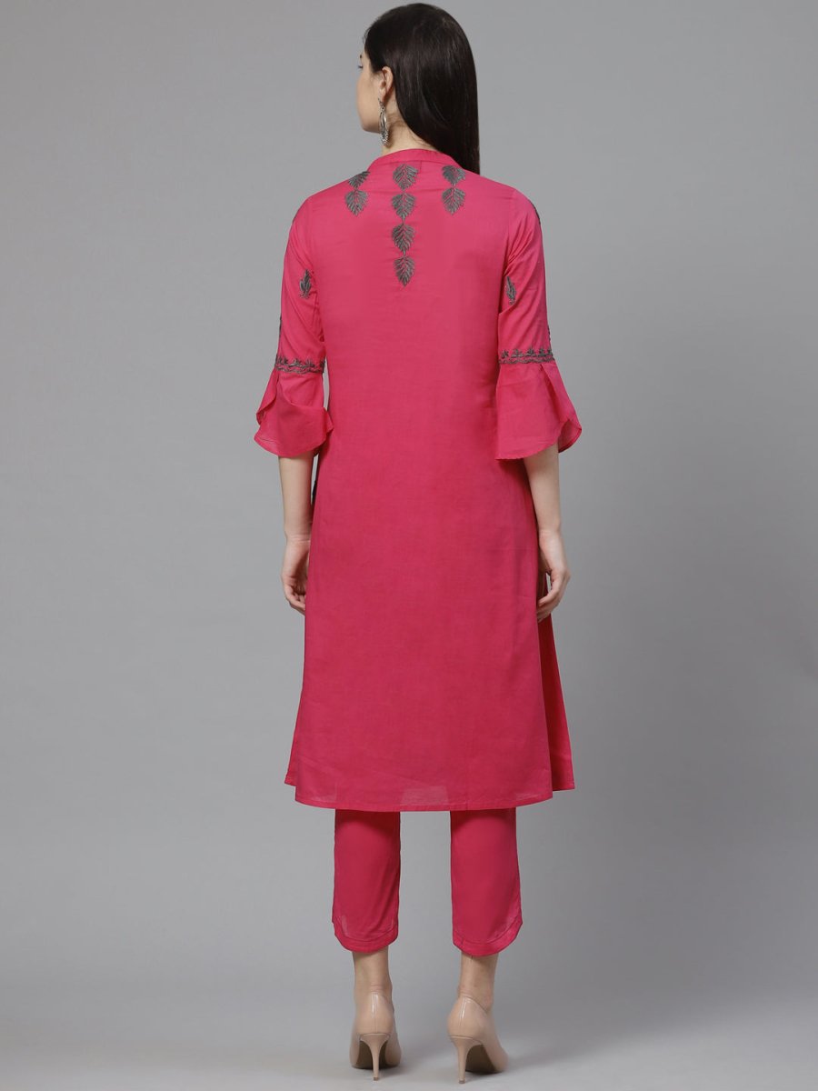Pink and charcoal grey chikankari embroidered?A-line calf length kurta, has a mandarin collar, three-quarter sleeves, curved hem