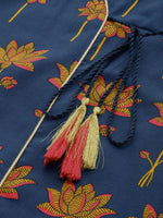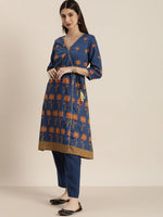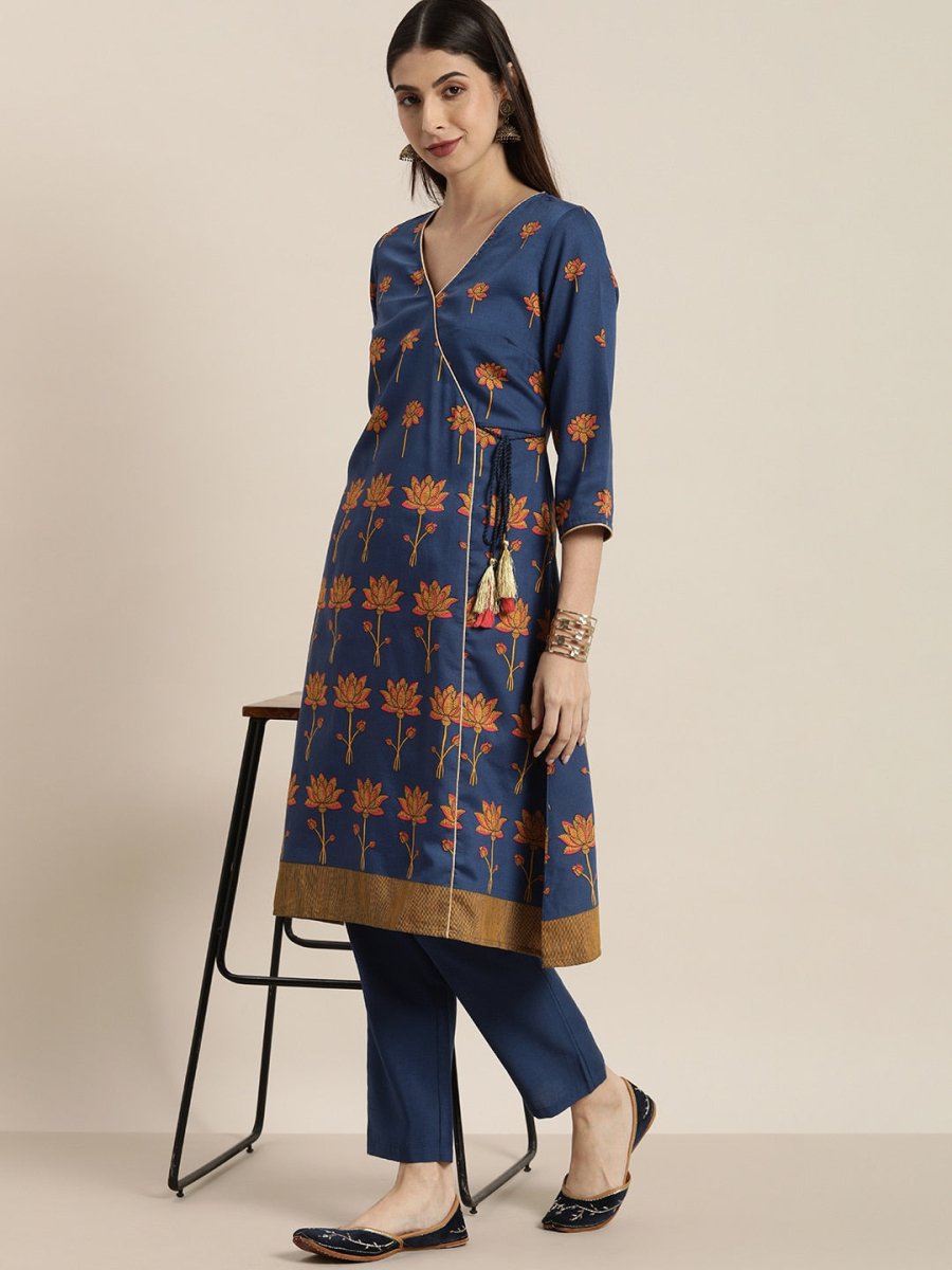 All About You Women Blue Floral Printed Angrakha Kurta with Trousers